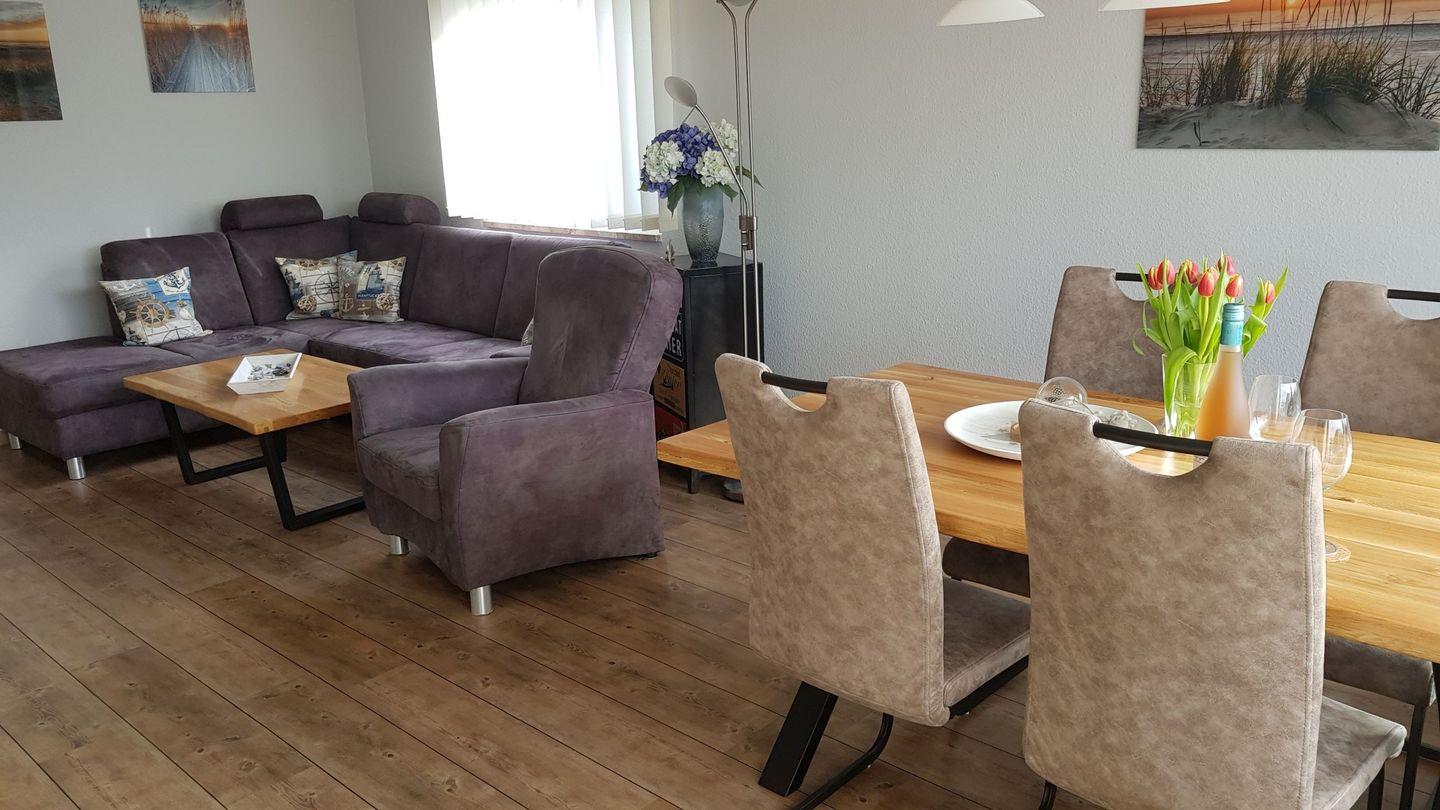 Im Wohnzimmer stehen Ihnen ein Sofa, Sessel, Esstisch für 4 Personen und Schrankraum zur Verfügung. Ein 40-Zoll Flachbildschirm (Smart TV) und eine DAB+ Musikanlage mit USB-Wiedergabe und Bluetooth sind ebenso vorhanden.