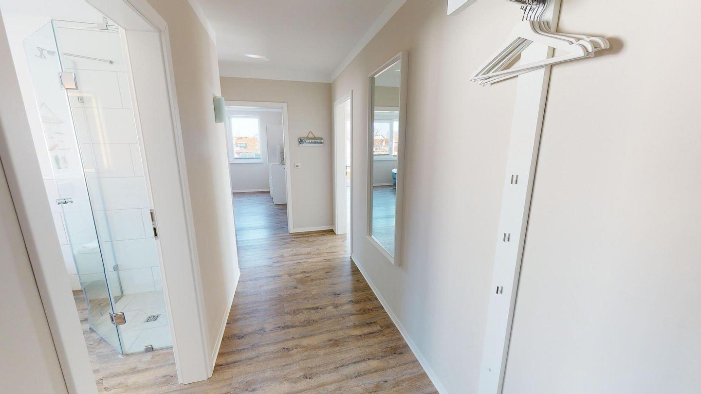 Die beiden Schlafzimmer sind mit hochwertigen Boxspringbetten ausgestattet, inklusive Verdunklungsplissees und Flachbildfernsehern. Das Apartment verfügt über ein Duschbad mit einer Regenbrause sowie ein weiteres Badezimmer mit einer Whirlwanne. In beiden Bädern finden sich beleuchtete Wand- und Kosmetikspiegel sowie Wandradios mit Bluetooth-Verbindung. Das Wohnzimmer zeichnet sich durch seine Helligkeit aus, während die voll ausgestattete Küche zum Genießen einlädt. Ein Essbereich und ein gemütlicher Sofabereich mit Kaminofen vervollständigen den Wohnraum.