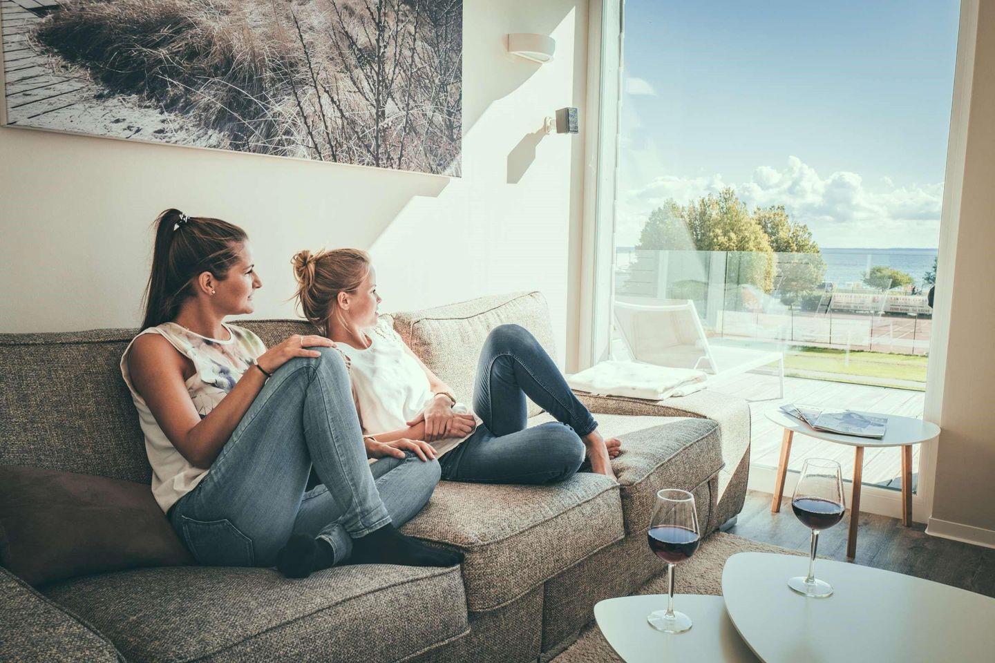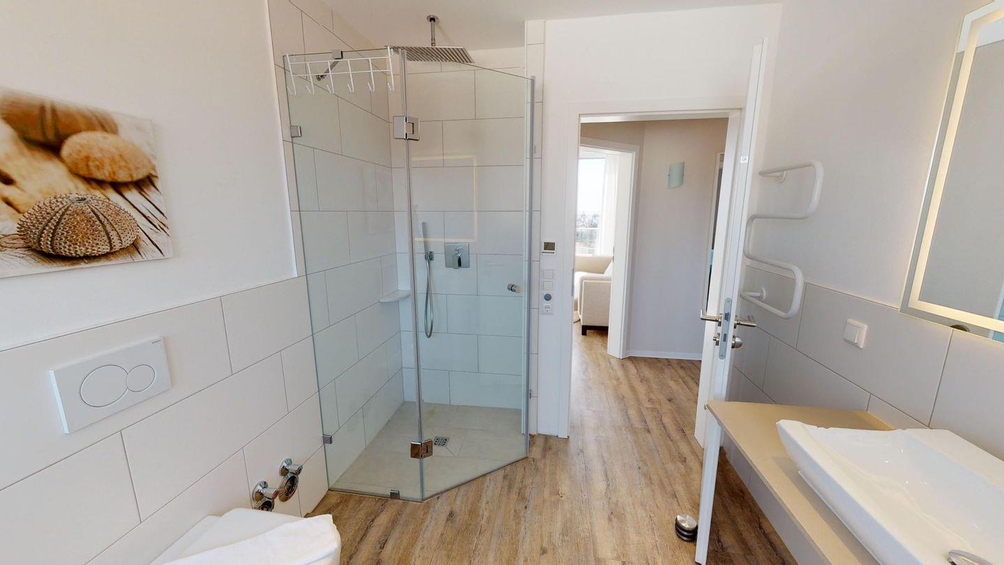Die drei Schlafzimmer sind mit hochwertigen Boxspringbetten ausgestattet, inklusive Verdunklungsplissees und Flachbildfernsehern. Zwei Duschbäder mit Regenbrause sind über die jeweiligen Schlafzimmer erreichbar, während das dritte Duschbad mit Regenbrause und Whirlwanne über den Flur zugänglich ist. Alle drei Bäder sind mit beleuchteten Wand- und Kosmetikspiegeln sowie Wandradios mit Bluetooth-Verbindung ausgestattet.