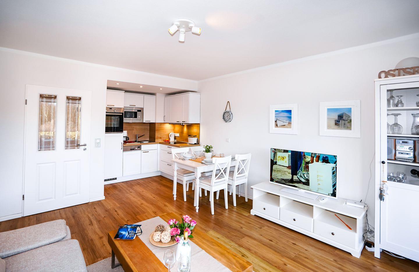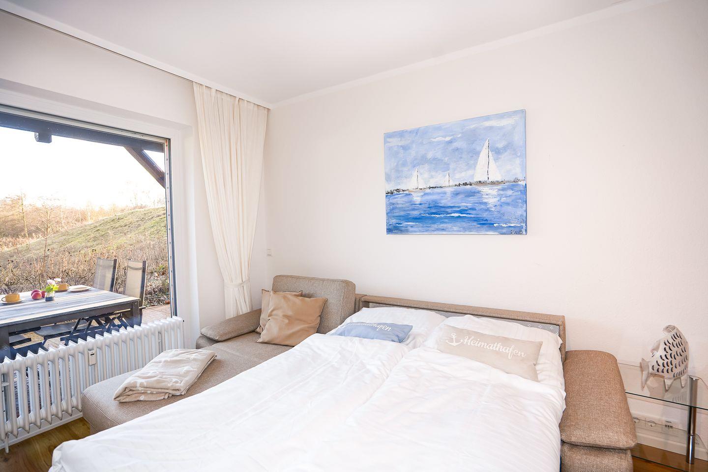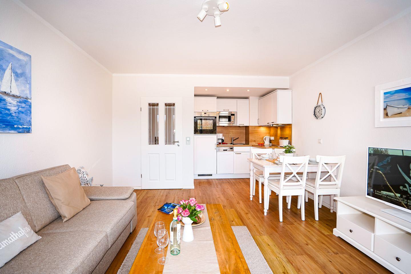 Im Wohnzimmer befinden sich eine hochwertige -Schlafcouch (neu in 2023), Esstisch für 4 Personen sowie ein Fernseher, Radio und CD-Player.