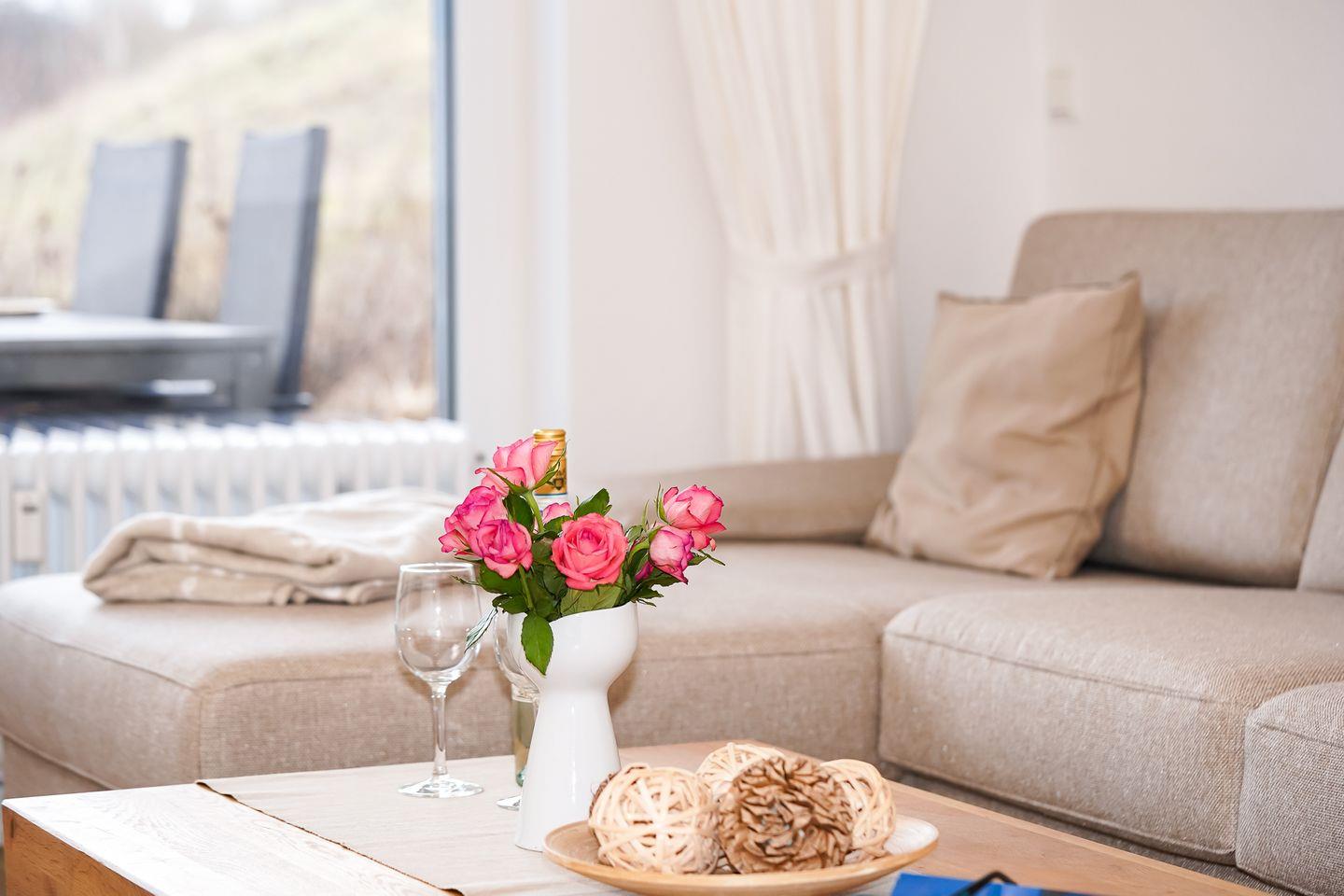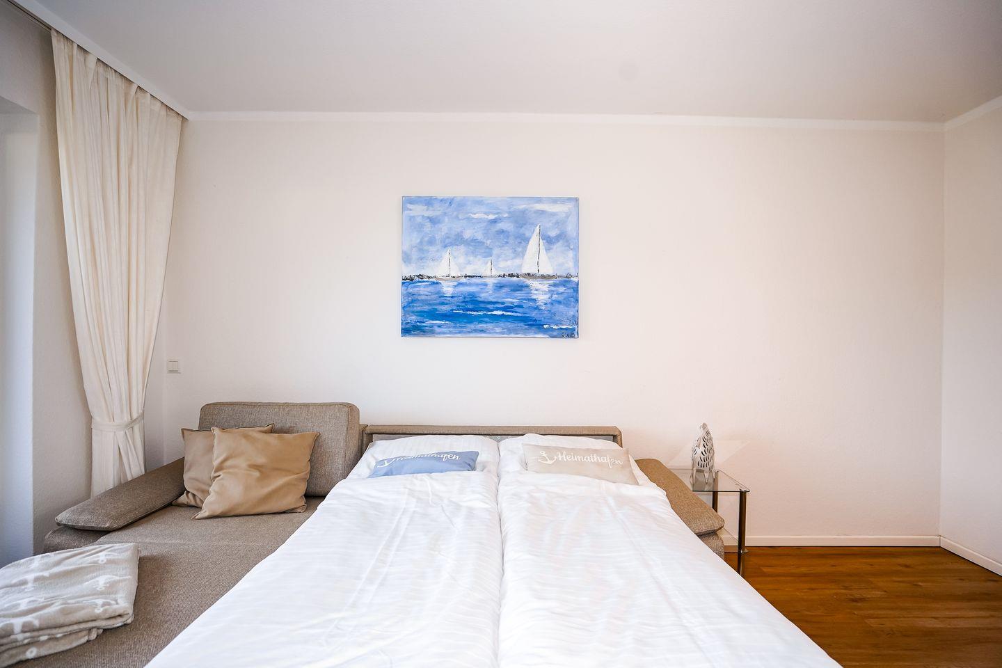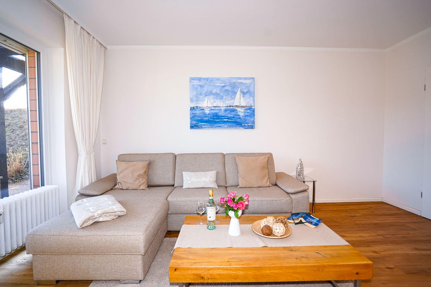 Im Wohnzimmer befinden sich eine hochwertige -Schlafcouch (neu in 2023), Esstisch für 4 Personen sowie ein Fernseher, Radio und CD-Player.