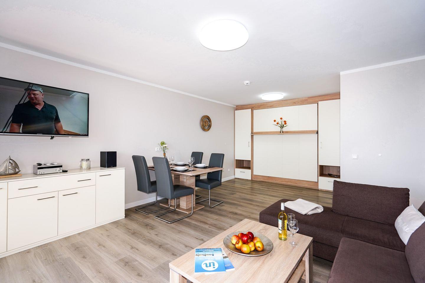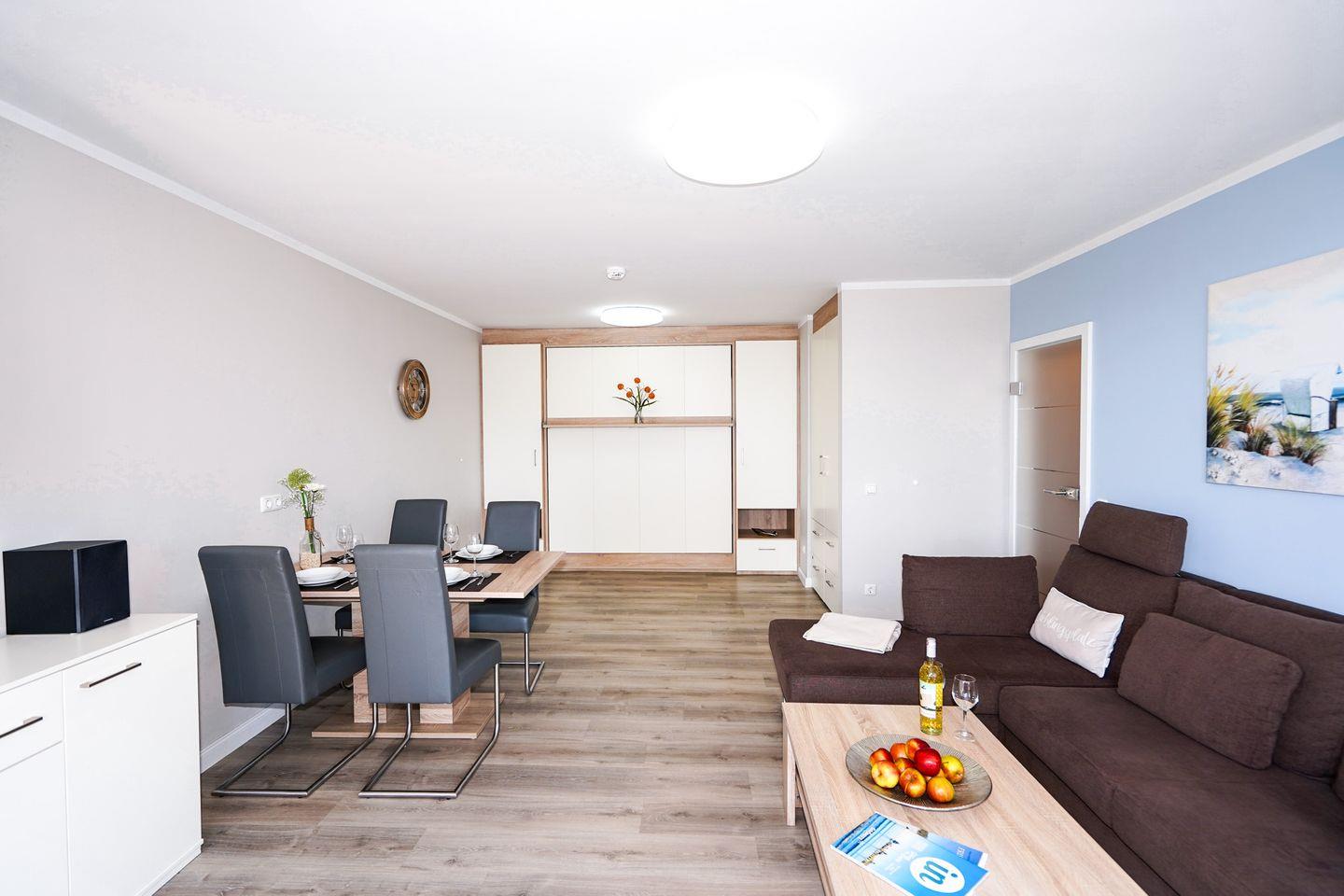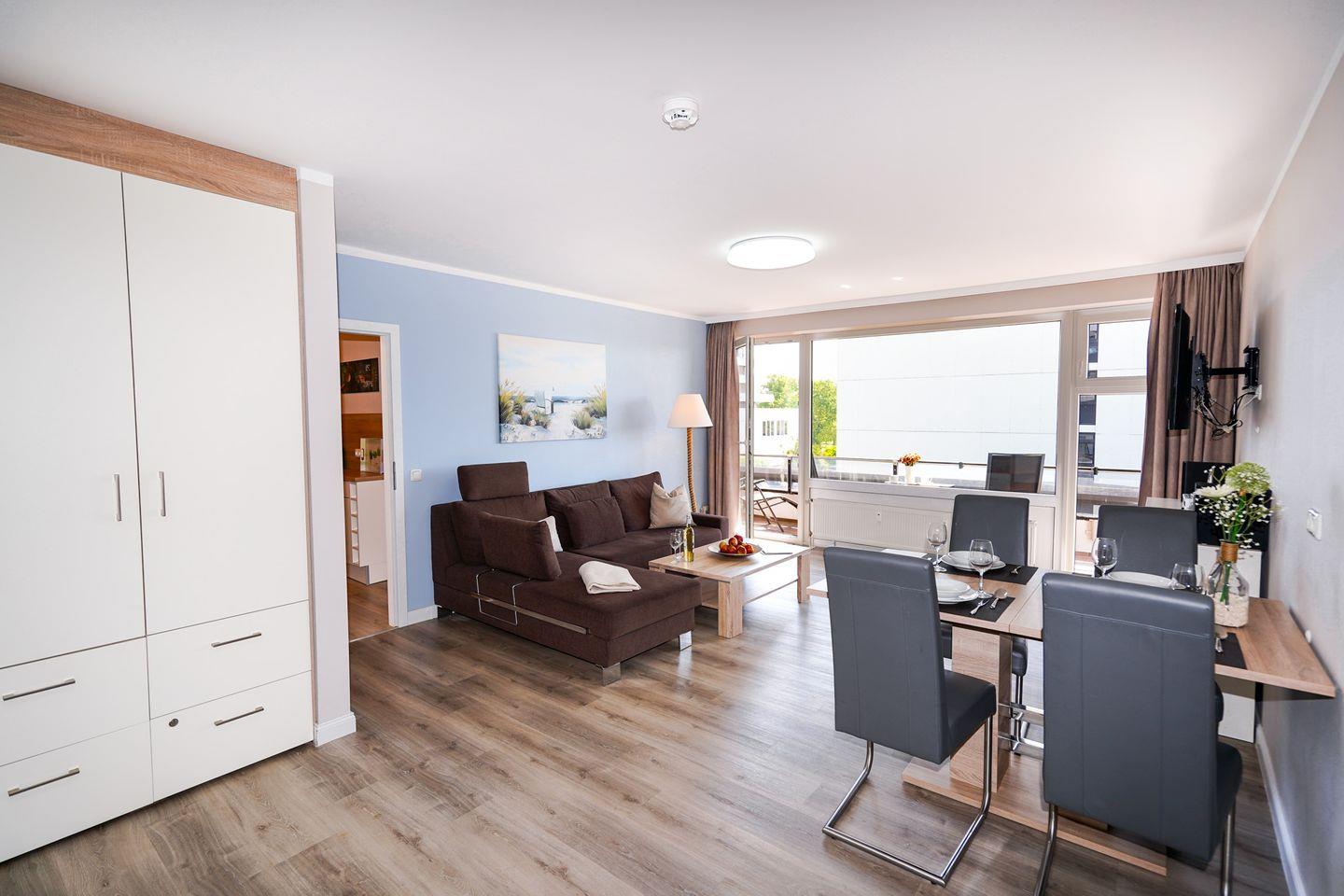 Der Prinzenhof ist eine sehr gepflegte Apartmentanlage in bevorzugter und zentraler Lage ,nur ca. 90 Meter zum Strand. Die helle, im 2. Stock gelegene neu möbliert und renovierte 2-Zimmer-Wohnung ist ideal für den Strandurlaub. Das sonnige Wohnzimmer ist ausgestattet mit einem großen Sofa, ein Essplatz für 4 Personen und einem Schrankbett (2 x 90 x 200). Das Schrankbett ist höher gelegen und daher angenehm zum Ein.- und Aussteigen. Kleiderschränke sind auch im Wohnzimmer vorhanden. Ein großer Flach-TV mit 125 cm Diagonale, WLAN und Radio/CD runden das Bild ab. Das Wohnzimmerfenster lässt sich abdunkeln. Die Küche beinhaltet alle wichtigen Küchengeräte wie Geschirrspüler, Backofen mit Mikrowelle usw. Das Schlafzimmer ist mit einem Boxspringbett (2x90x200) und zwei Kleiderschränke ausgestattet. Die gesamte Wohnung ist mit Vinyl-Laminat ausgelegt. Vom Balkon in Südlage können Sie mit Teilmeerblick die Ostsee genießen.