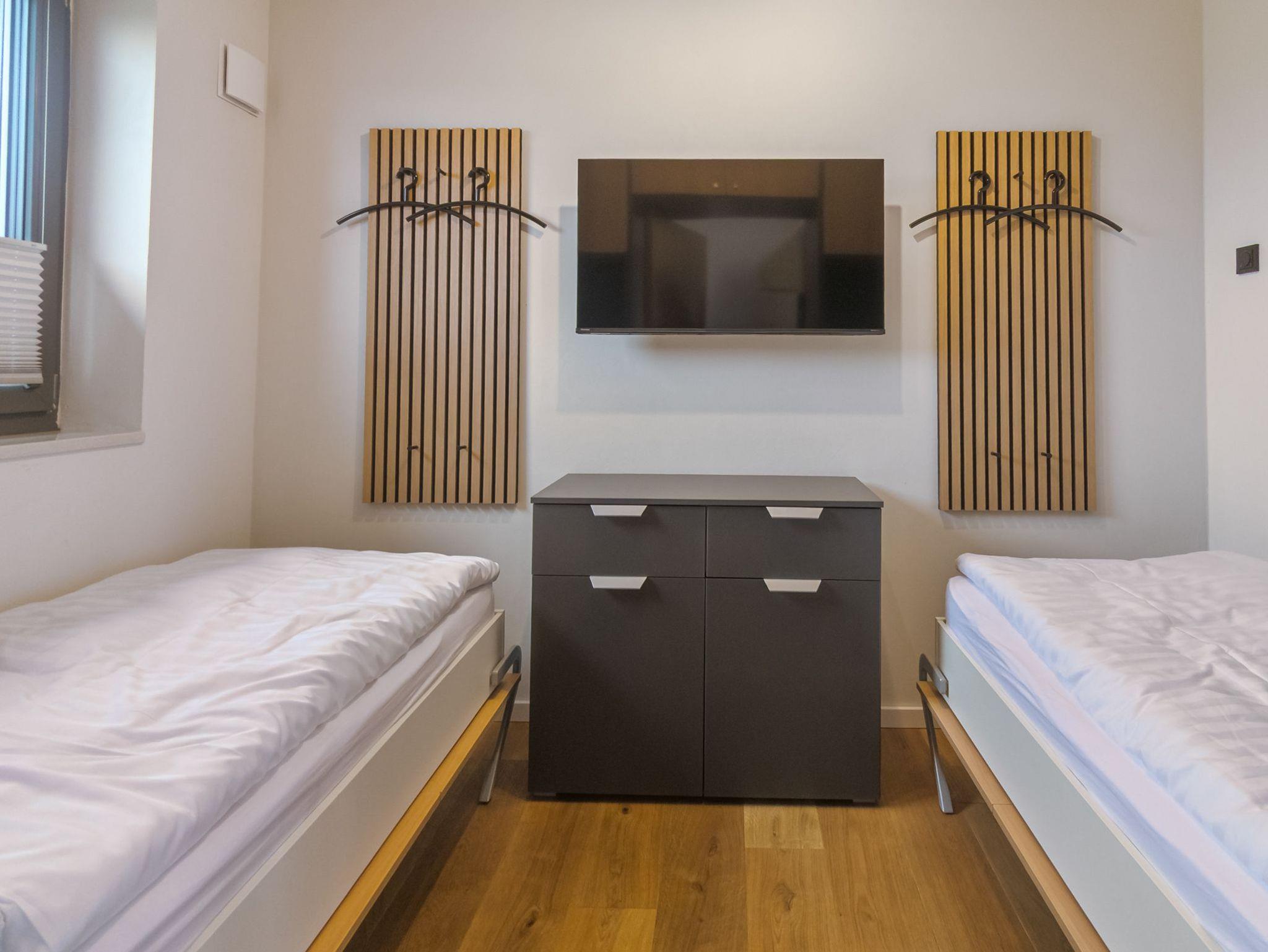 Die Wohnung ist mit zwei Schlafzimmern, einem Badezimmer und Wohnzimmer mit Küchenzeile ausgestattet. Das zweite Schlafzimmer hat Einzelstehende Wandklappbetten.