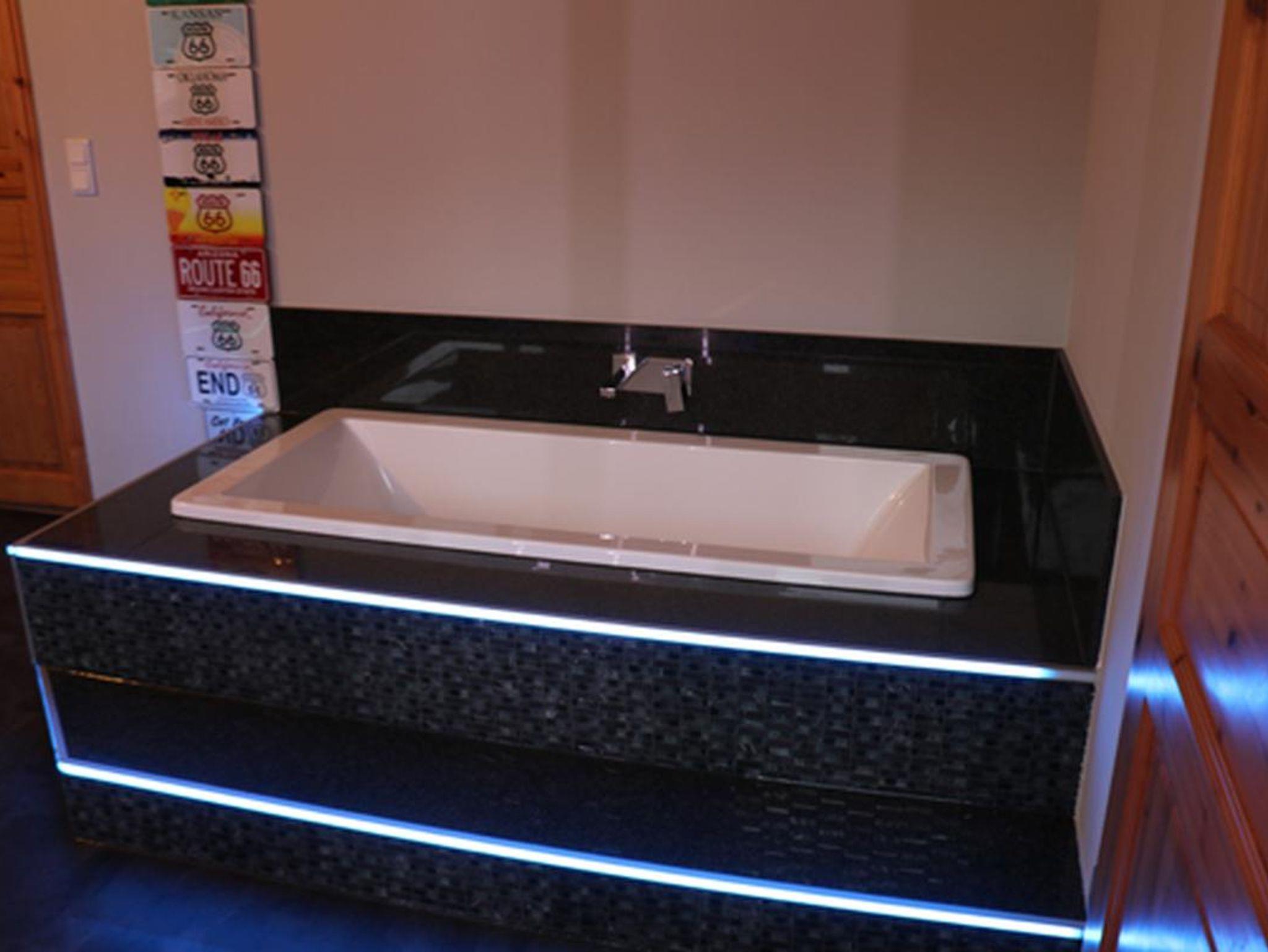 Badausstattung: Bad mit Badewanne, großer ebenerdiger Dusche, zwei Waschbecken, Toilette separat, Waschmaschine inkl. Trockner