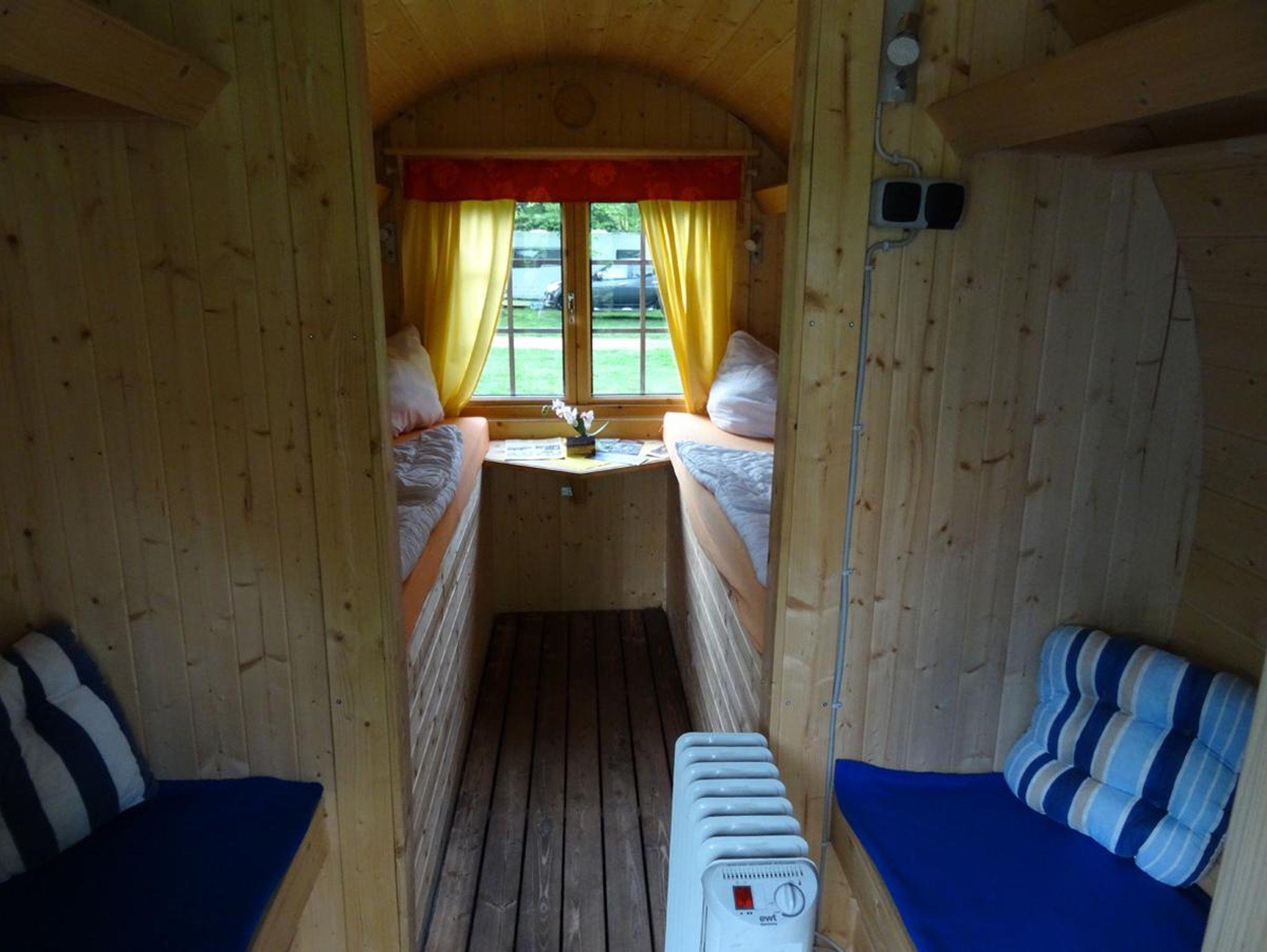 2 Einzelbetten 70 x 190 cm, kleiner Tisch zwischen den Betten, zwei Einzel-Sitzbänke innen und außen Elektro-Heizung Bettwäsche kann ausgeliehen oder eigene mitgebracht werden Duschen, Toiletten und Spülküche sind im Sanitärgebäude zu nutzen Keine Kochgelegenheit oder ähnliches in der FH vorhanden