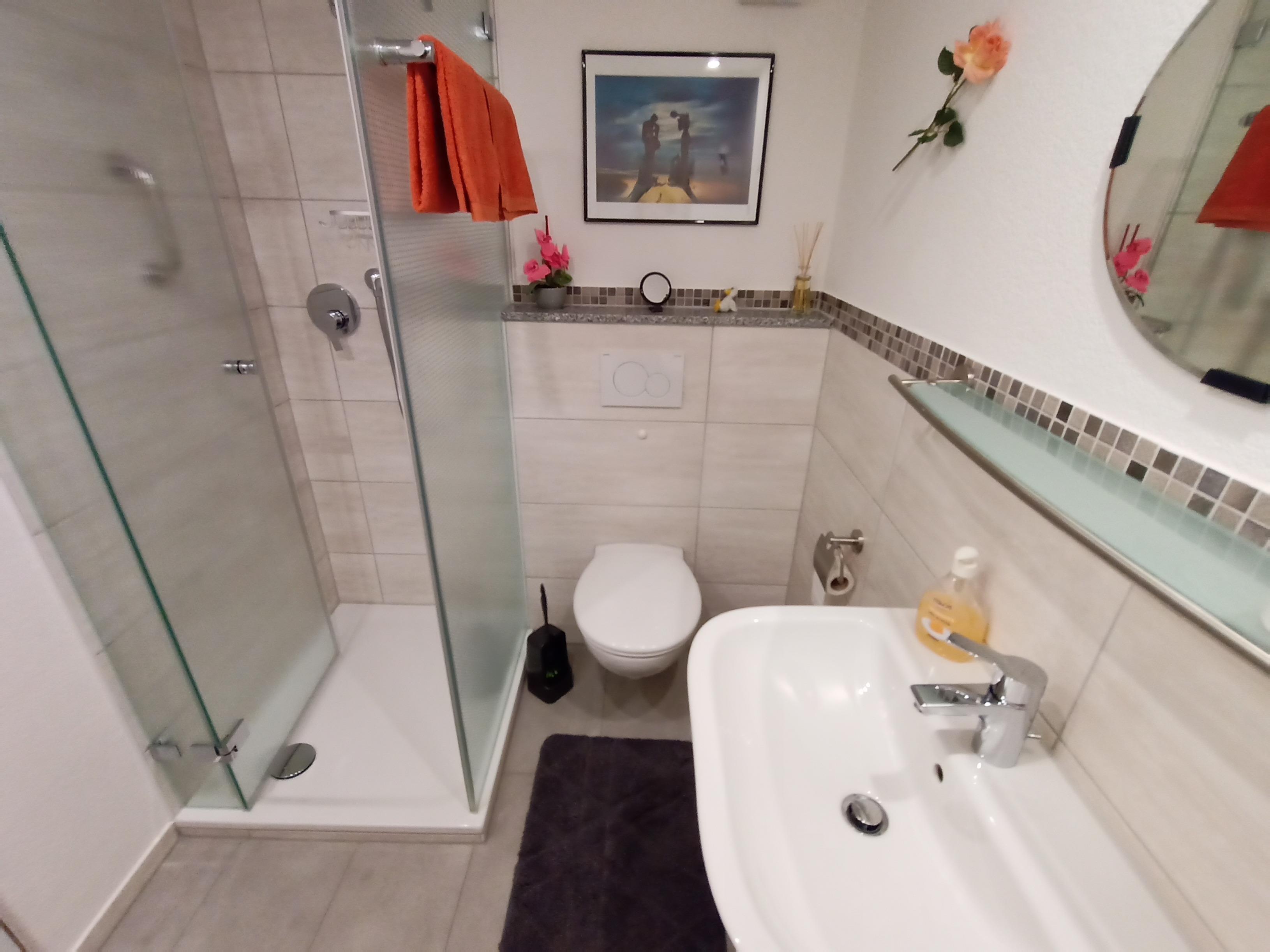 Ein kleiner Rundgang durch unsere Ferienwohnung gefällig? - Sie werden sich wie zu Hause fühlen. Im geräumigen Wohnraum befindet sich die Kochecke. Sie ist mit allem Notwendigen ausgestattet. Sie finden in "Ihrer" Kochecke alles vom Büchsenöffner über die Kaffeemaschine bis hin zur Mikrowelle oder zum Backofen. Ein separates Schlafzimmer mit Doppelbett steht Ihnen zur Verfügung, in welchem auch der Eingang der Ferienwohnung ist bzw. die große Terrasse mit schönem Garten. Durch das Schlafzimmer gelangen Sie in den Wohnraum mit Essplatz und Küchenzeile. Das neu renovierte Badezimmer befindet sich schräg gegenüber der Wohnung (Kellerflur ohne Benutzung) und ließ sich baulich leider nicht in die Wohnung intergrieren. Wir wahren aber Ihre Privatsphäre.