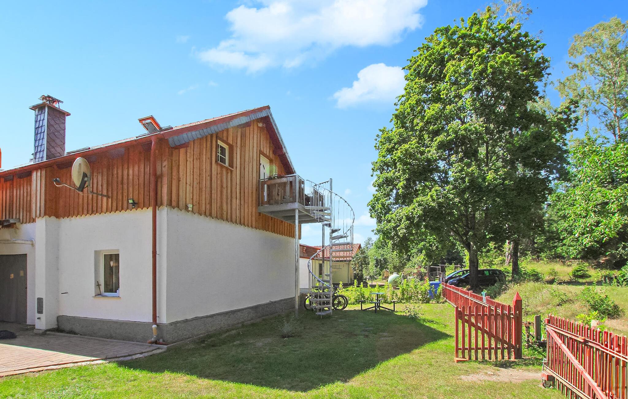 Die 40 qm große Zweiraum-Ferienwohnung für max. 3 Personen befindet sich separat im Obergeschoss eines Wohnhauses auf dem 10.000 qm großen Wohn- und Naturgrundstück des Eigentümers im abgelegenen kleinen Ortsteil Vogelheidi, in ruhiger Waldlage. Zugang über eine steile Außen-Spindeltreppe. Die Wohnung ist ausgestattet mit einem Wohnraum (Polstermöbel mit Schlaffunktion als Aufbettungsmöglichkeit für die 3. Pers., Flachbild-TV, Radio), einer offenen Küchenzeile (Esstisch, E-Herd mit Backofen, Kühlschrank, Tiefkühlschrank, div. Küchengeräte), einem Schlafraum (Doppelbett) sowie einem Bad mit Badewanne (enger Einstieg). Zur Verfügung stehen außerdem W-LAN, eine möblierte Sitzecke im Freien, Grillmöglichkeit, Unterstellmöglichkeit für mitgebrachte Fahrräder und Parkplatz. Für Kleinkinder können ein Kinderbett und ein Hochstuhl bereitgestellt werden.