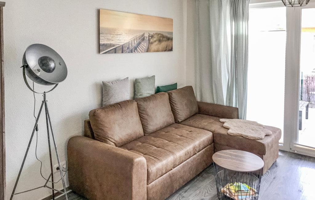 Die Ferienwohnung für bis zu 4 Personen, ist modern und maritim eingerichtet und befindet sich ebenerdig im Erdgeschoss. Hier finden Sie einen Wohn/Essbereich mit einer offener Küche, ein separates Schlafzimmer sowie ein Badezimmer mit ebenerdiger Walk-In Dusche. Das Schlafzimmer verfügt über ein Doppelbett, zwei weitere Schlafplätze (Schlafsofa) befinden sich im Wohnbereich. Auf der Terrasse können Sie frühstücken und die ersten Sonnenstrahlen des Tages genießen oder auch den Tag gemütlich ausklingen lassen (Gartenmöbel vorhanden).