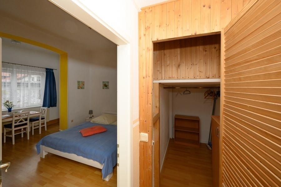 Stranddistel (2-3 Pers.). Villa Christiana, Graal-Müritz: 1. Stock (Haupthaus), 30+ qm. Flur (mit begehbarem Schrankraum), Küche mit Essbereich, Badezimmer (DU/WC), Schlafzimmer und Leiter-Hochbett.