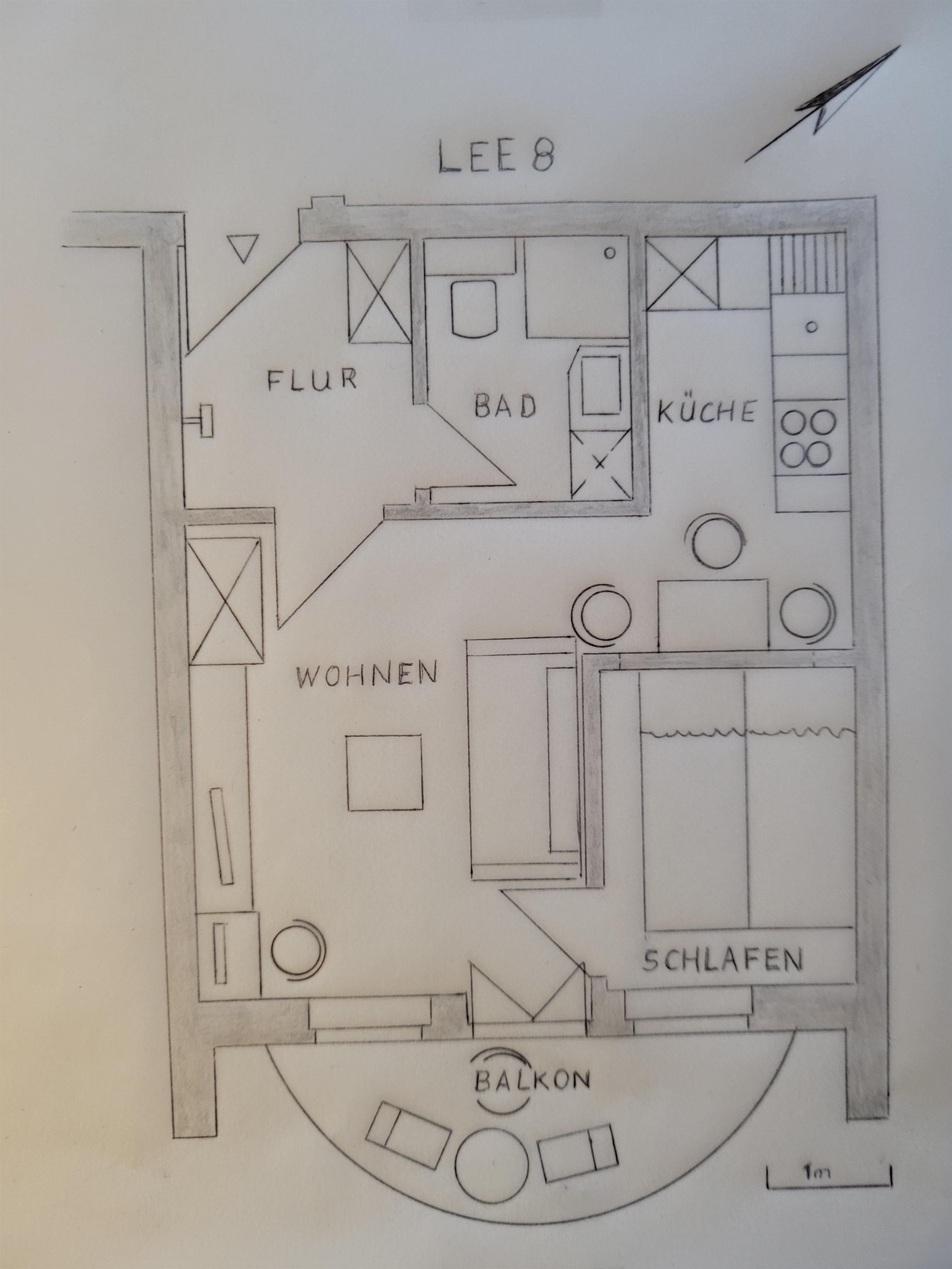 Die Wohnung ist für 3 Personen in Familienformation, für 3 Jugendliche oder für 2 Erwachsene mit Kleinkind ausgelegt. Es gibt auch einen kleinen Computerarbeitsplatz. Der Balkon zeigt in Richtung Süden und ist halb überdacht (Sonne bis ca. 13:30 Uhr).
