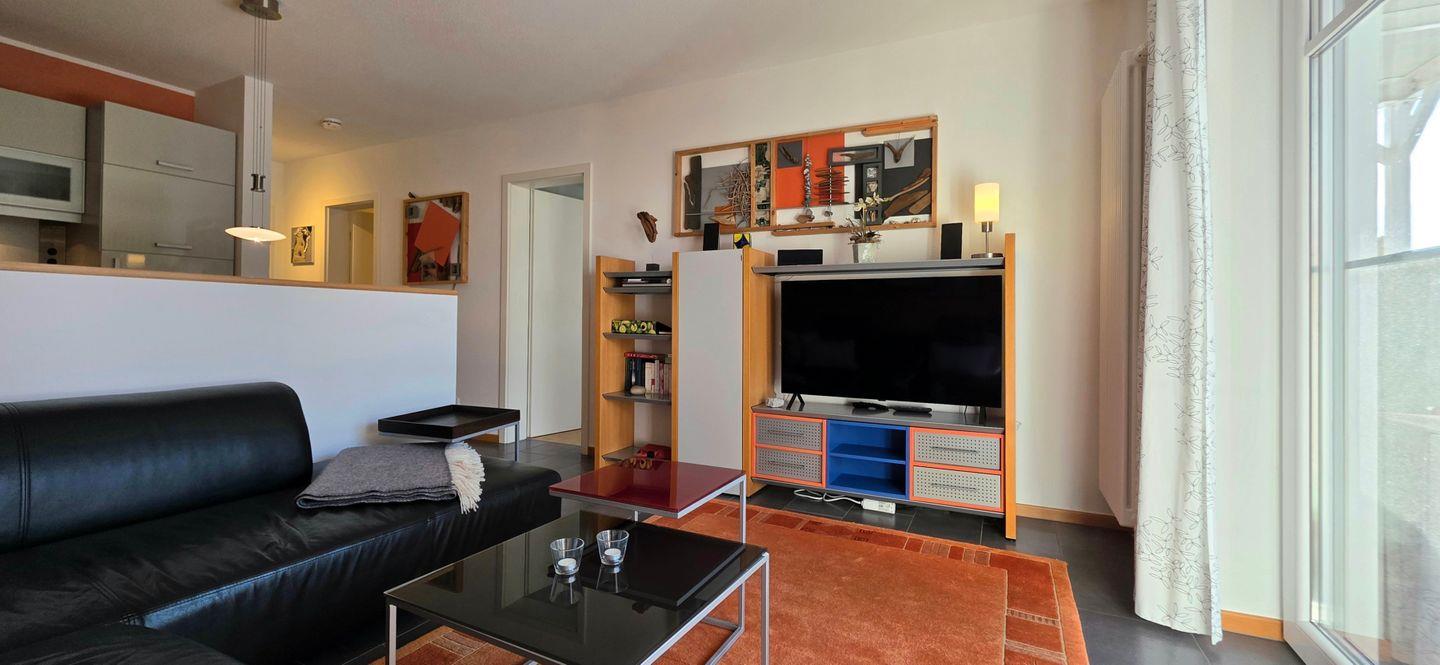 - im Wohnbereich befindet sich ein gemütliches Ecksofa in Echtleder, ein Smart-TV sowie eine HiFi-Anlage
