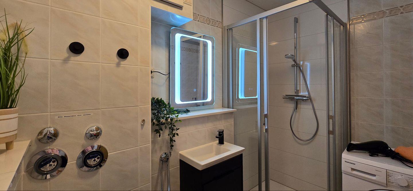 • Badezimmer mit Dusche, Waschmaschine und Haartrockner