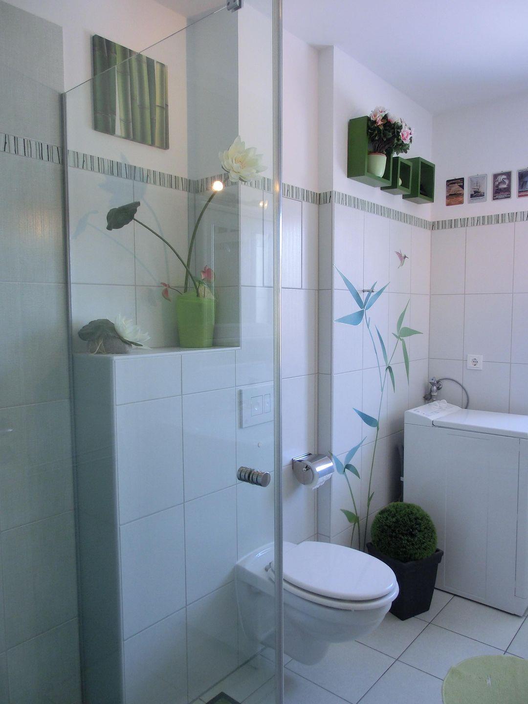 - Duschbadezimmer mit Echtglasdusche, Waschmaschine und Fön