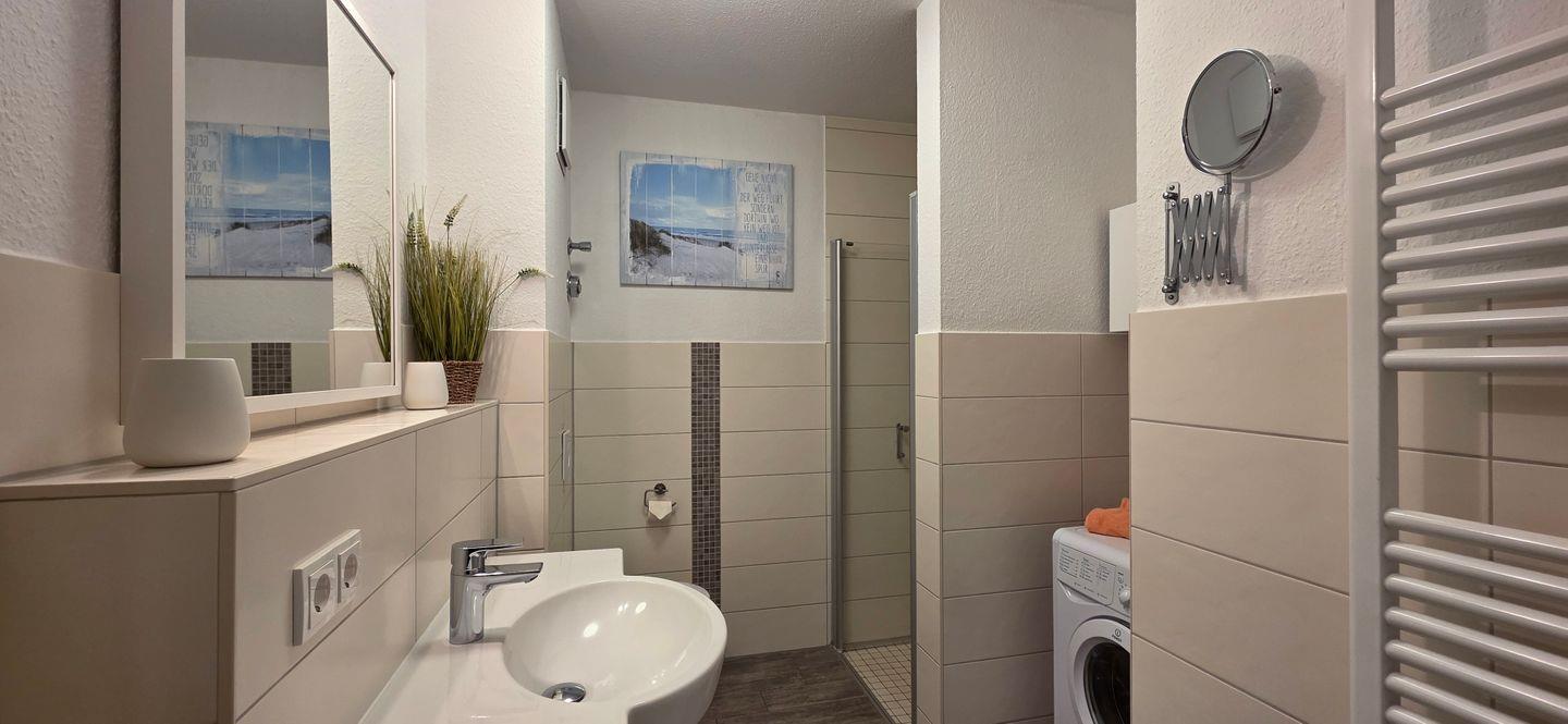 - Das moderne Badezimmer bietet neben Dusche, Fön, WC und Waschtisch, genügend Ablagefläche.