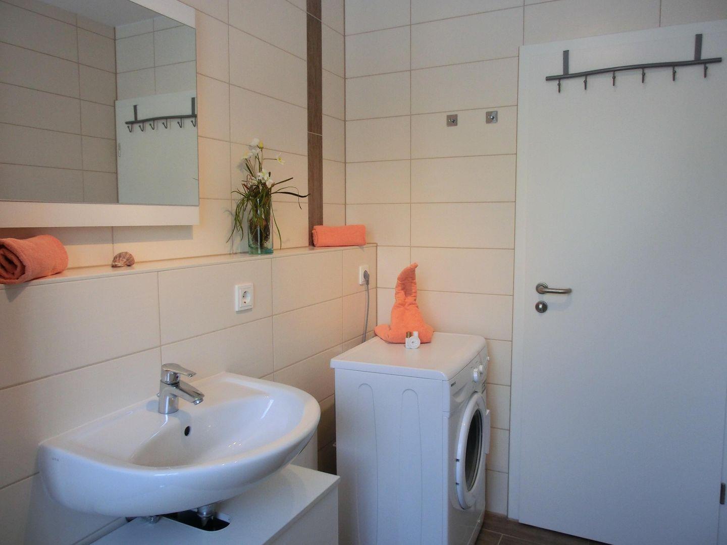 - Das Badezimmer mit Fenster, bietet neben Dusche und WC genügend Ablagefläche. Eine Waschmaschine ist ebenfalls vorhanden.