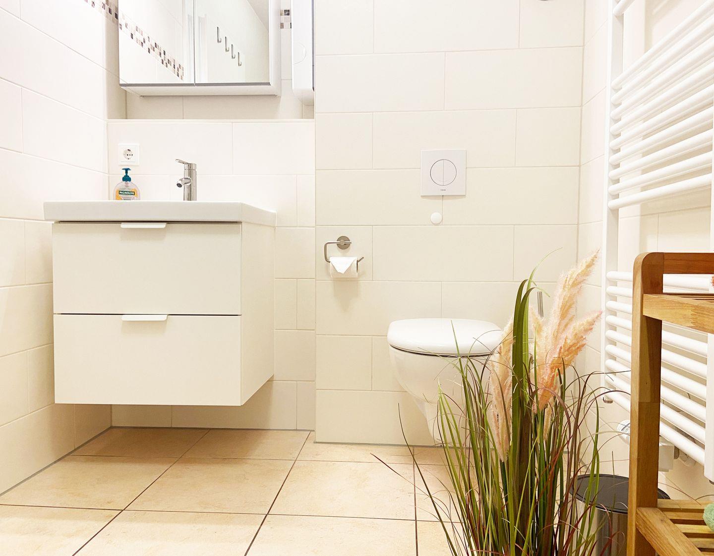 Im Badezimmer befindet sich eine ebenerdige Dusche, WC, ein Fön und genügend Ablagefläche. Zudem steht Ihnen eine Waschmaschine zur Verfügung.