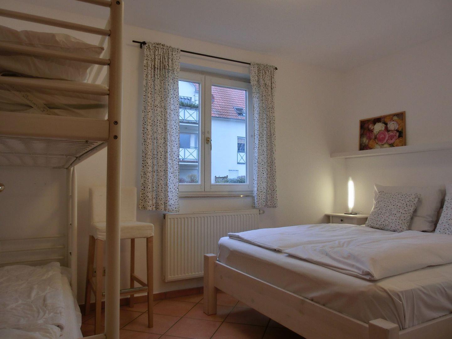 - 1 Schlafzimmer mit Doppelbett (160 cm x 200 cm, durchgehende Matratze) und einem Etagenbett (90 x 200 cm)