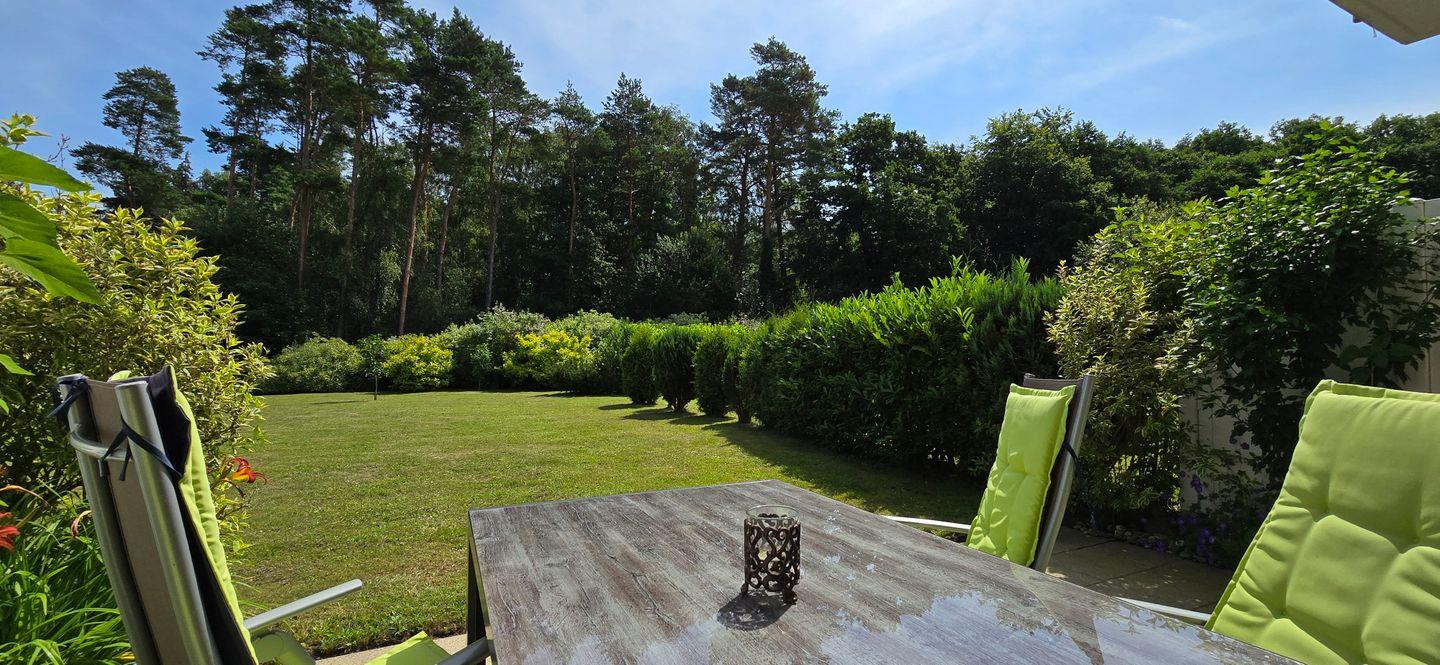 - möblierte Terrasse mit Rasenfläche und Holzkohlegrill