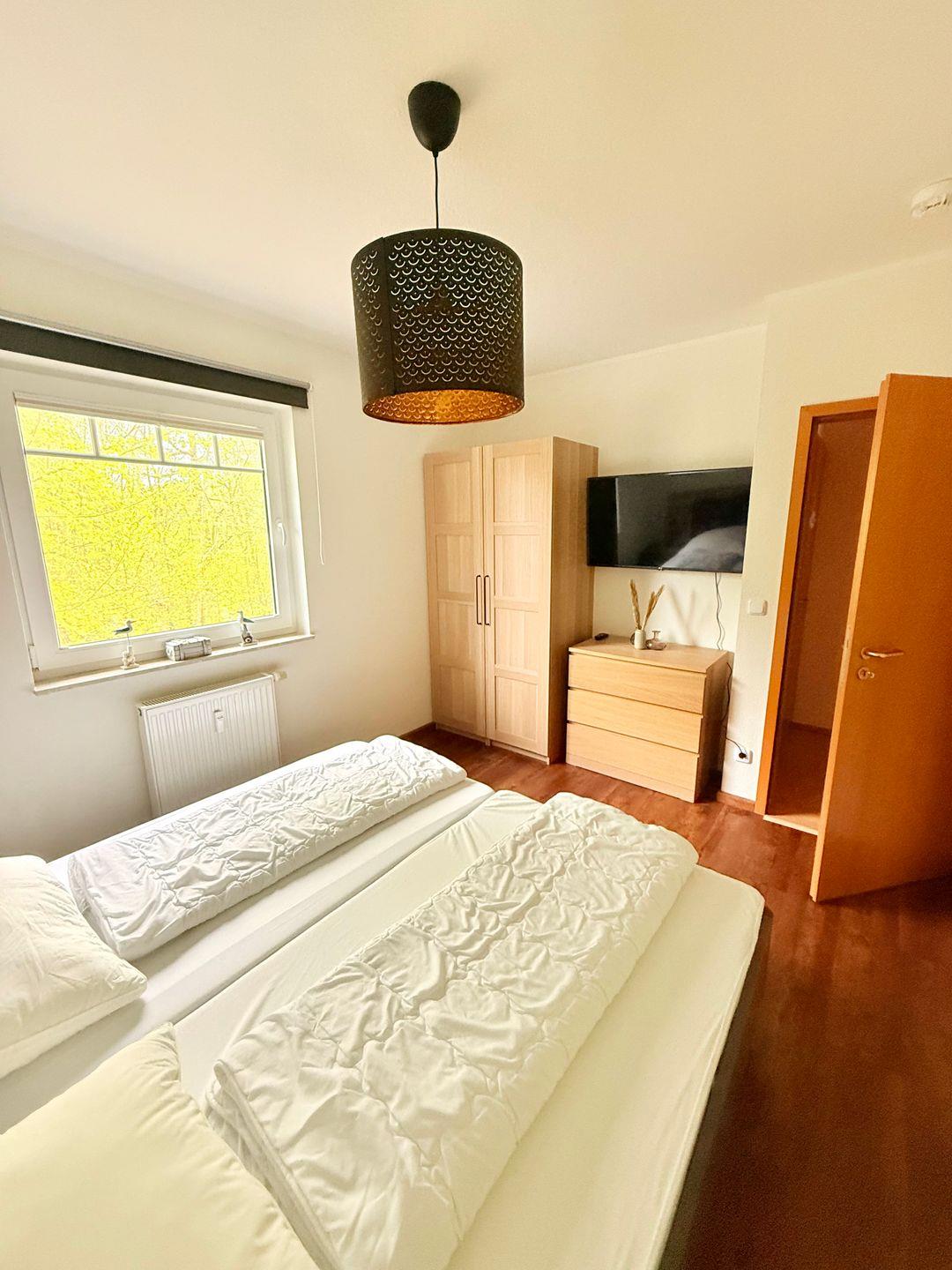 • Separates Schlafzimmer mit Doppelbett (180 cm × 200 cm, getrennte Matratzen) und zusätzlicher TV im Schlafzimmer