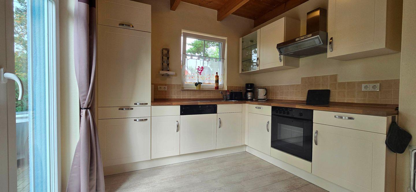 • Küche mit Geschirrspülmaschine, Herd mit Backofen, Kühlschrank mit Gefrierfach, Kaffeemaschine, Toaster und Wasserkocher
