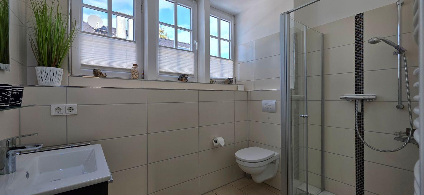 • 2 Badezimmer mit ebenerdiger Dusche und Fön