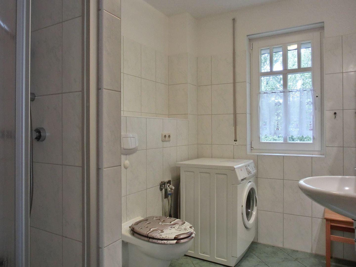 • Modernes Badezimmer mit Dusche, Waschtisch, Waschmaschine und Ablagefläche