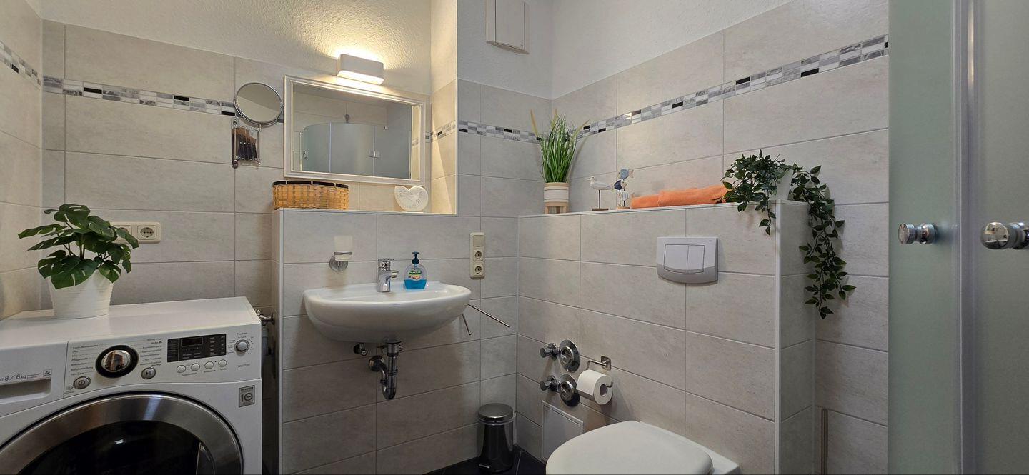- Badezimmer mit Dusche und Waschmaschine und Fön