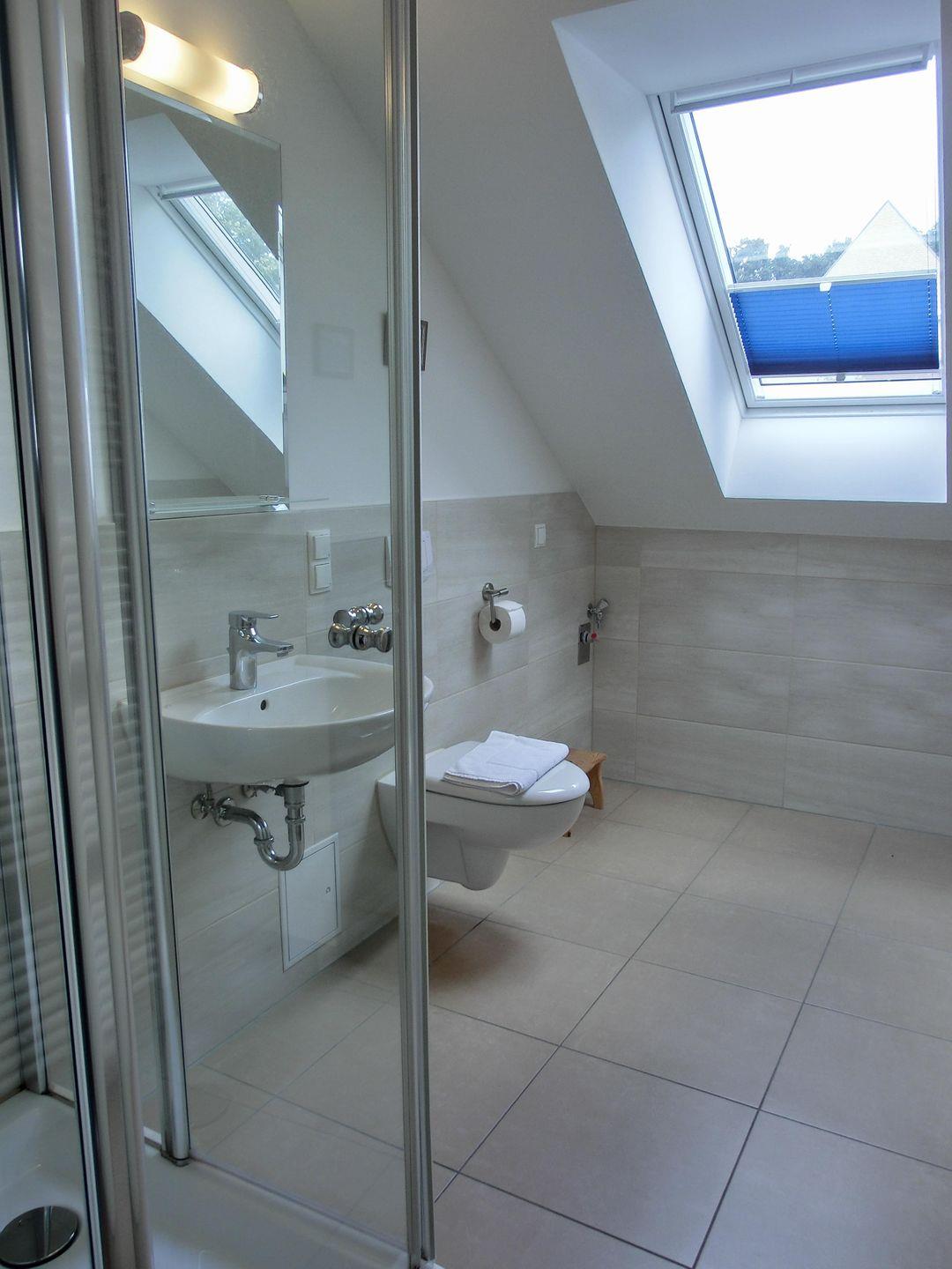 - Das moderne Tageslichtbad bietet neben Dusche mit ebenerdigen Einstieg und WC genügend Ablagefläche. Ein Kombigerät Waschmaschine/ Trockner kann genutzt werden.