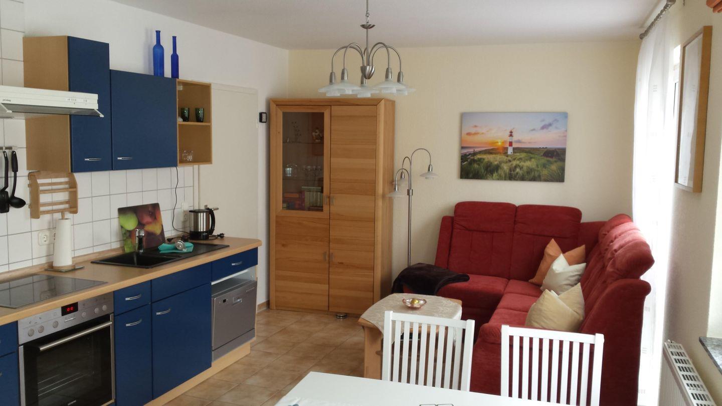 • Offene Küche mit Herd & Backofen, Kühlschrank mit kleinem Gefrierfach, Geschirrspülmaschine, Kaffeemaschine,