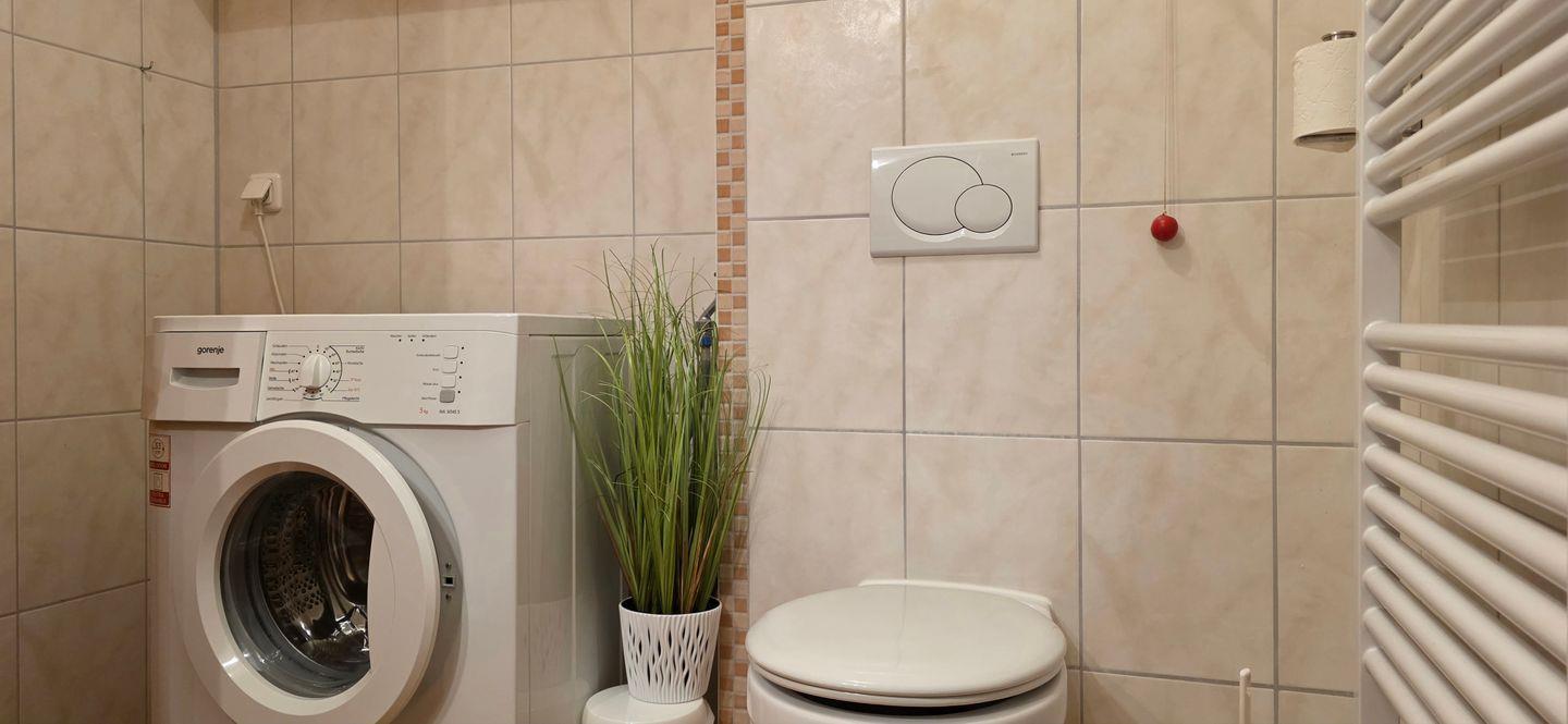 • modernes Badezimmer mit Dusche, WC, Waschmaschine und Haartrockner