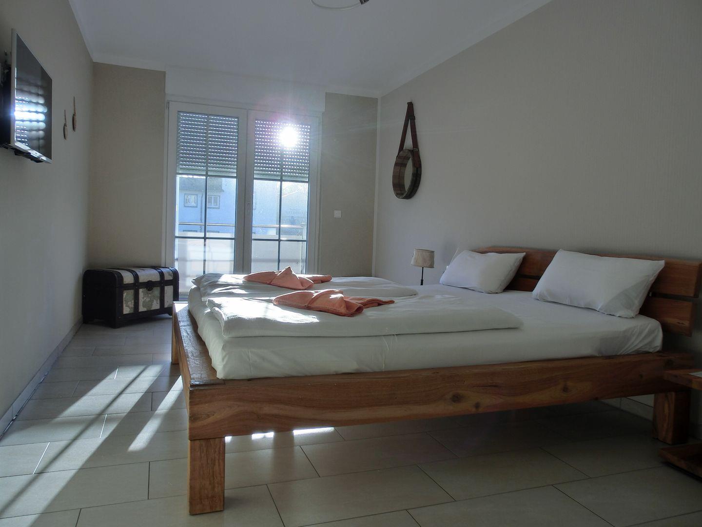 Schlafen Sie erholsam im bequemen Massivholzdoppelbett (180 cm x 200 cm) mit hochwertigen Matratzen und verstellbaren Lattenrosten. Ein zusätzliches TV Gerät von 32 Zoll ist direkt vor dem Bett an der Wand angebracht. Weiterhin gibt es für „ungebetene Gäste“ eine Fliegengittertür.