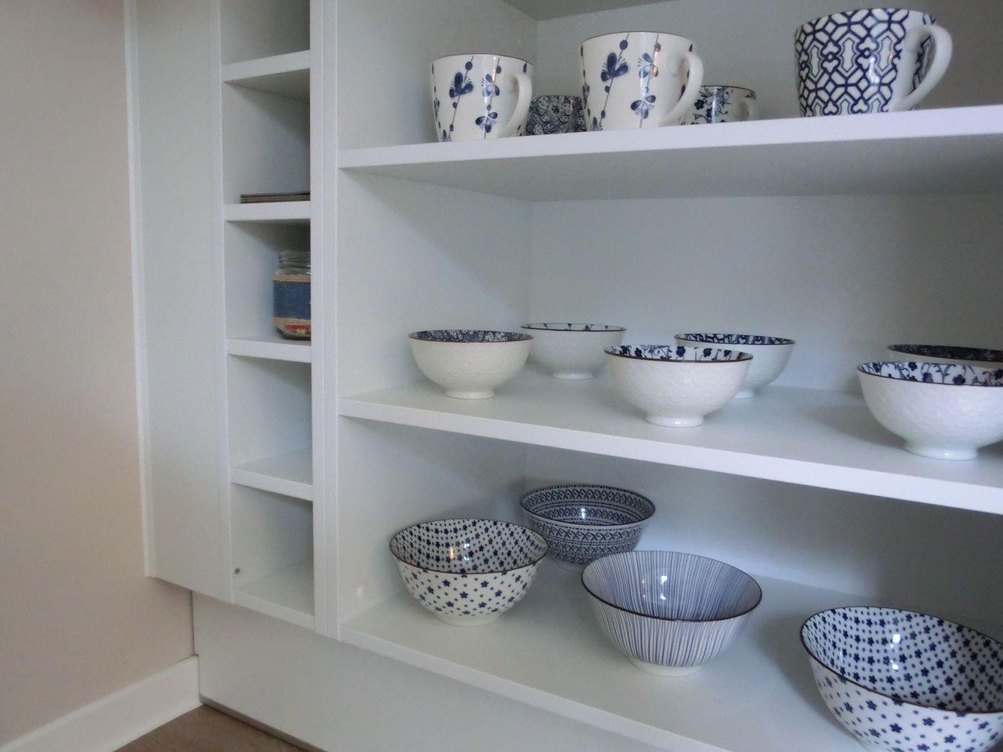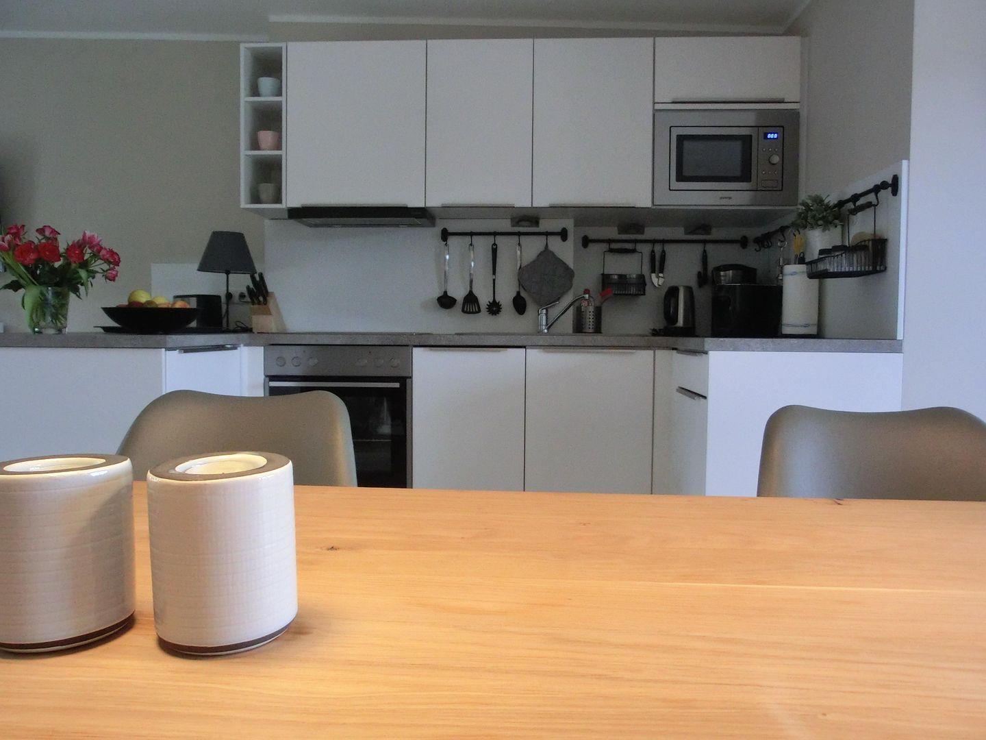 - offene Küche mit Geschirrspülmaschine, Herd, Backofen, Kühlschrank, Kaffeemaschine, Toaster und Wasserkocher