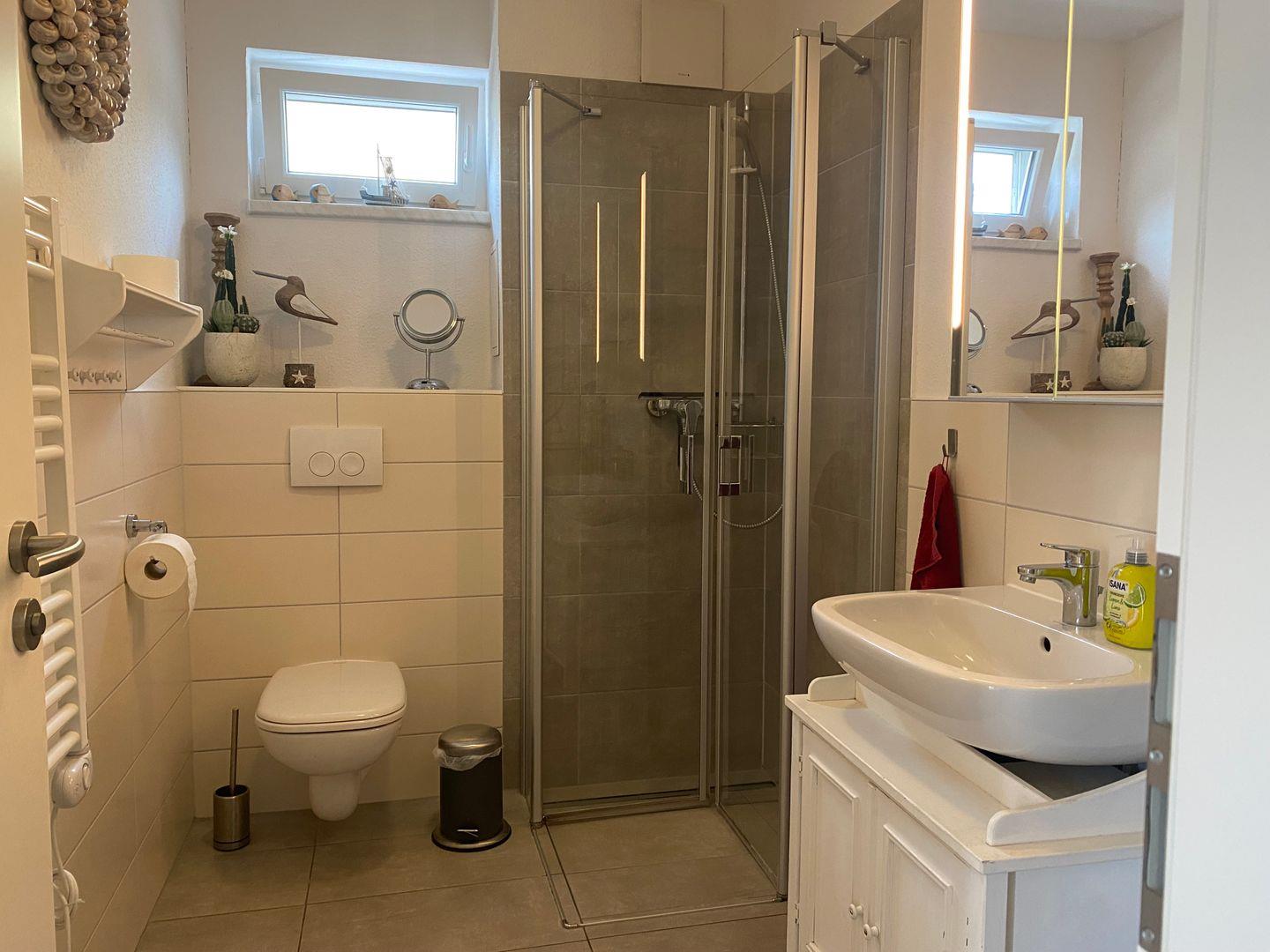 - Badezimmer mit ebenerdiger Dusche, WC, Waschbecken und genügend Ablagefläche