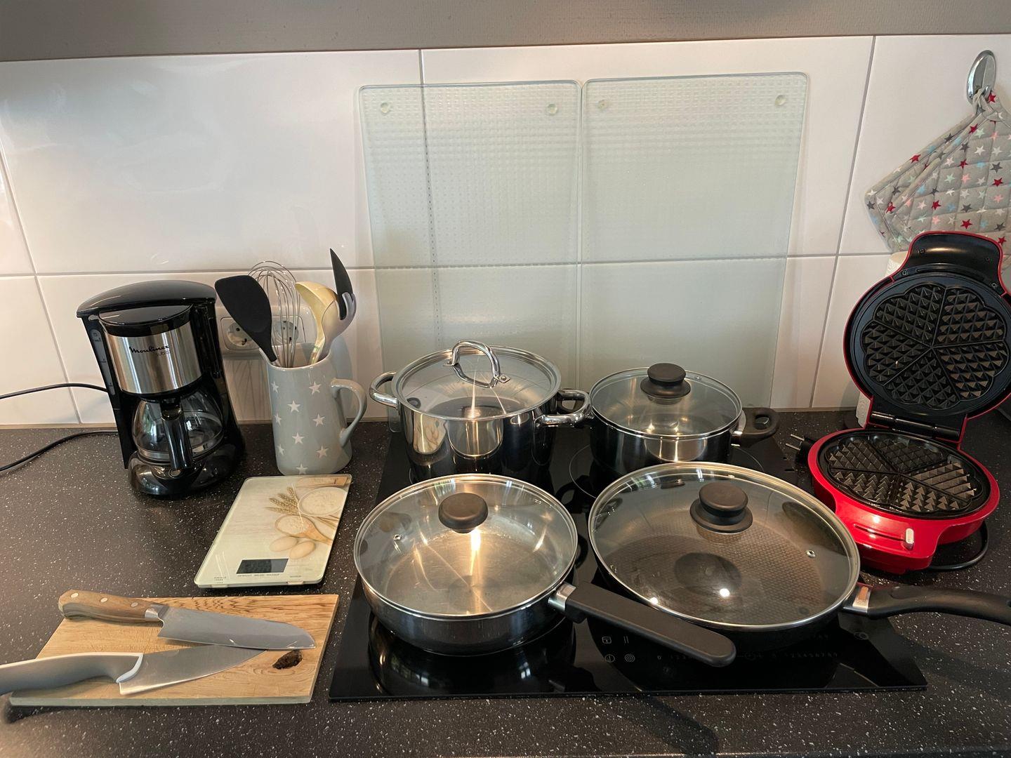 - offene Küche inkl. Ceranfeld, Geschirrspülmaschine, Kühlschrank mit Gefrierfach, Kaffeemaschine, Mikrowelle mit Dampfgarfunktion, Toaster, Wasserkocher, Geschirr, Besteck und Gläser sind ausreichend vorhanden