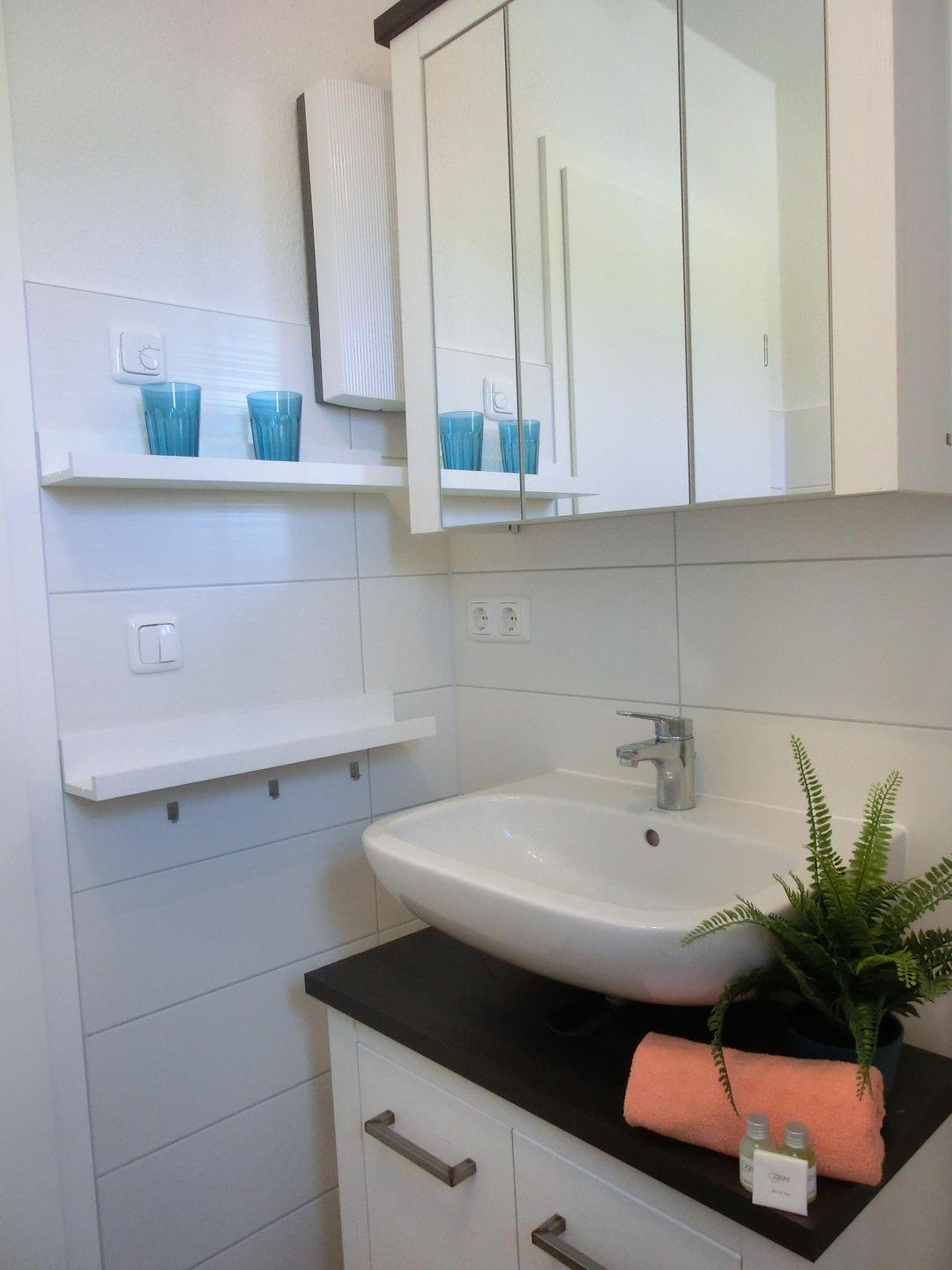 • Modernes Badezimmer mit Dusche, WC, Handtuchwärmekörper und Fön
