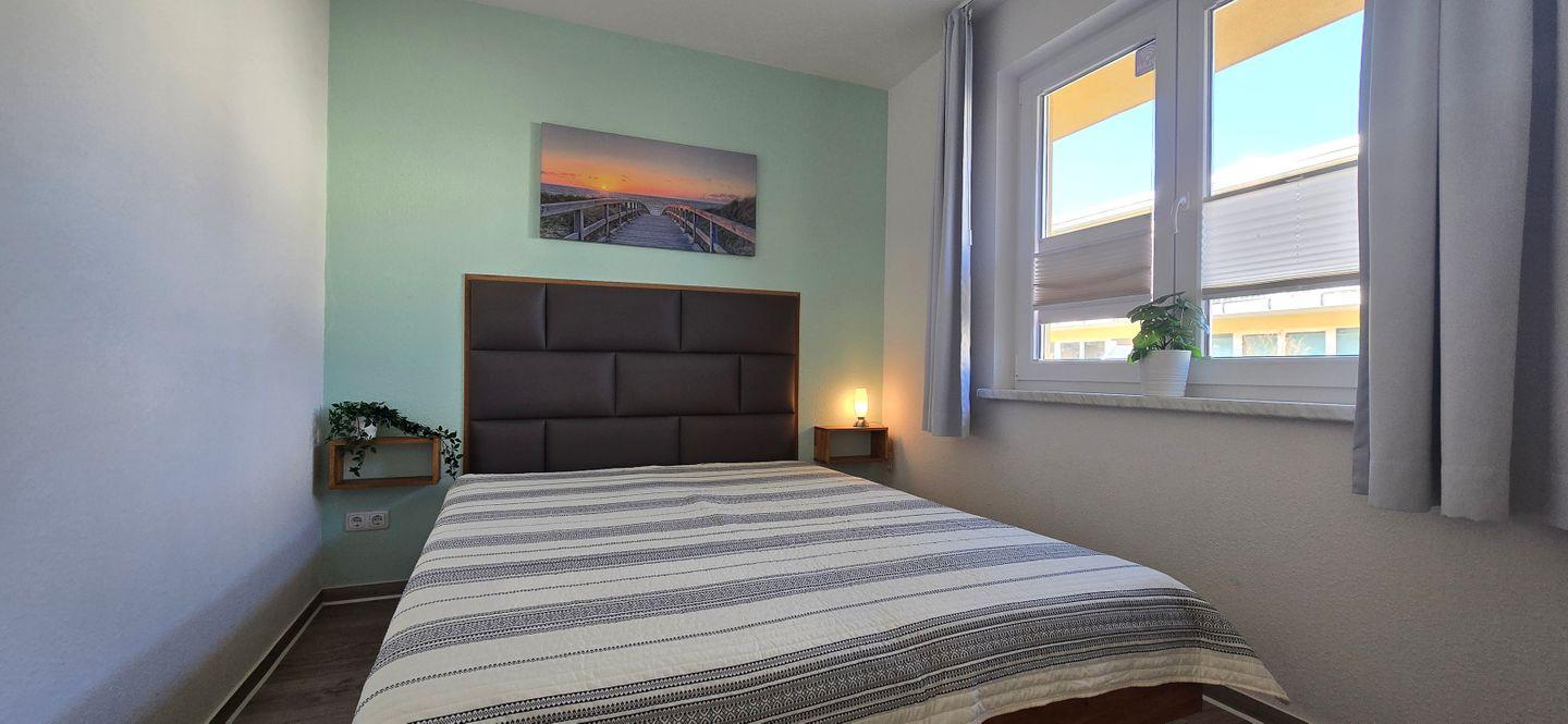 - ein Schlafzimmer mit Doppelbett für 2 Personen (160 cm x 200 cm bestehend aus zwei Matratzen 21 cm Höhe) und großem Kleiderschrank, eine Kofferablage ist auch vorhanden