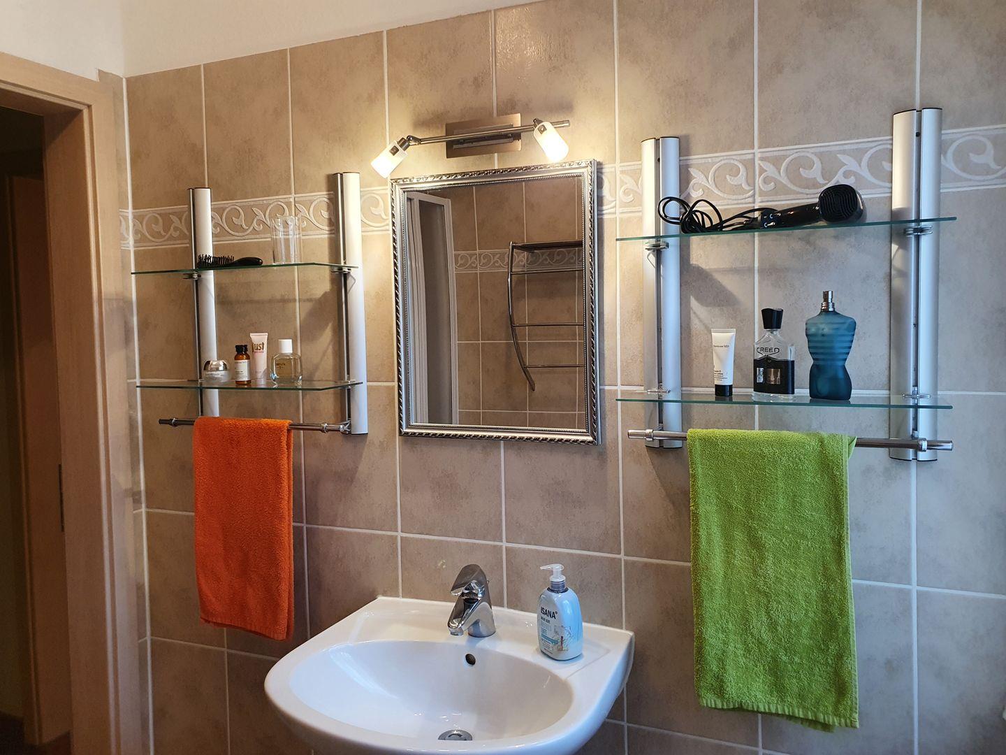 • Badezimmer mit Fenster, Dusche, WC, Waschtisch und großzügigen Ablagemöglichkeiten