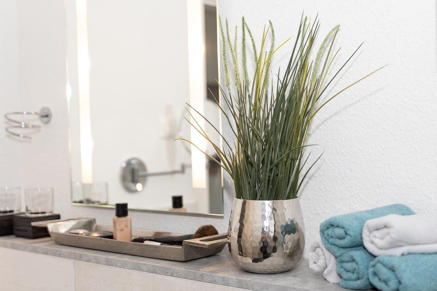 - Tageslichtbad mit WC, einer ebenerdigen Dusche, Fön, beheizbarer Handtuchhalter und genügend Ablagefläche