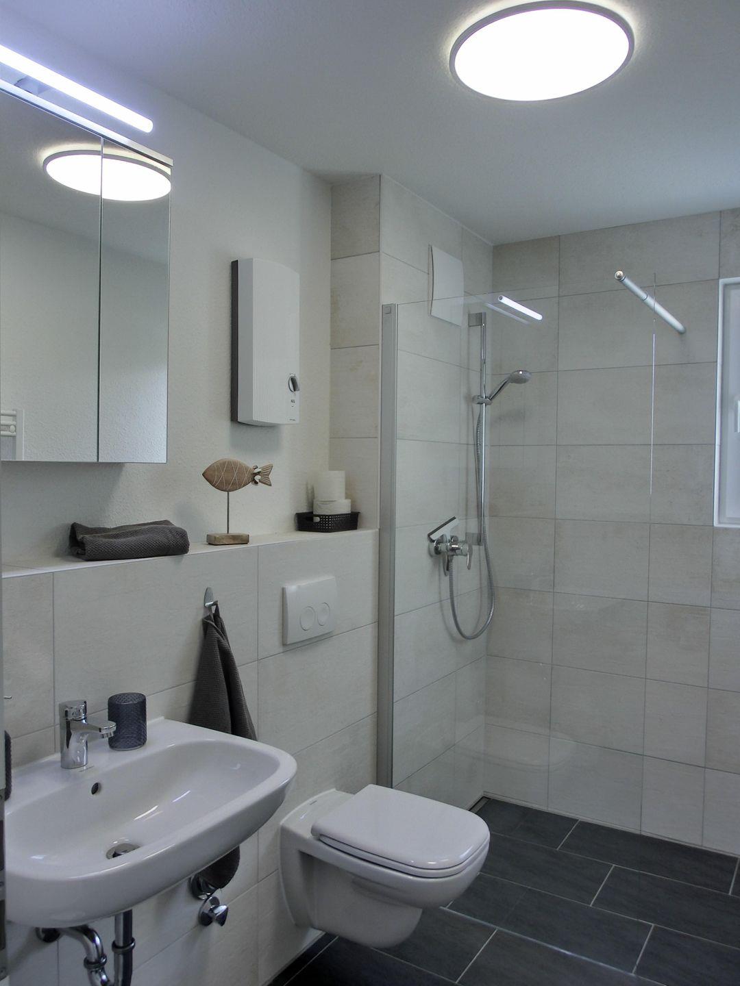 • Tageslichtbad mit ebenerdiger Dusche, Föhn und großzügigen Ablageflächen