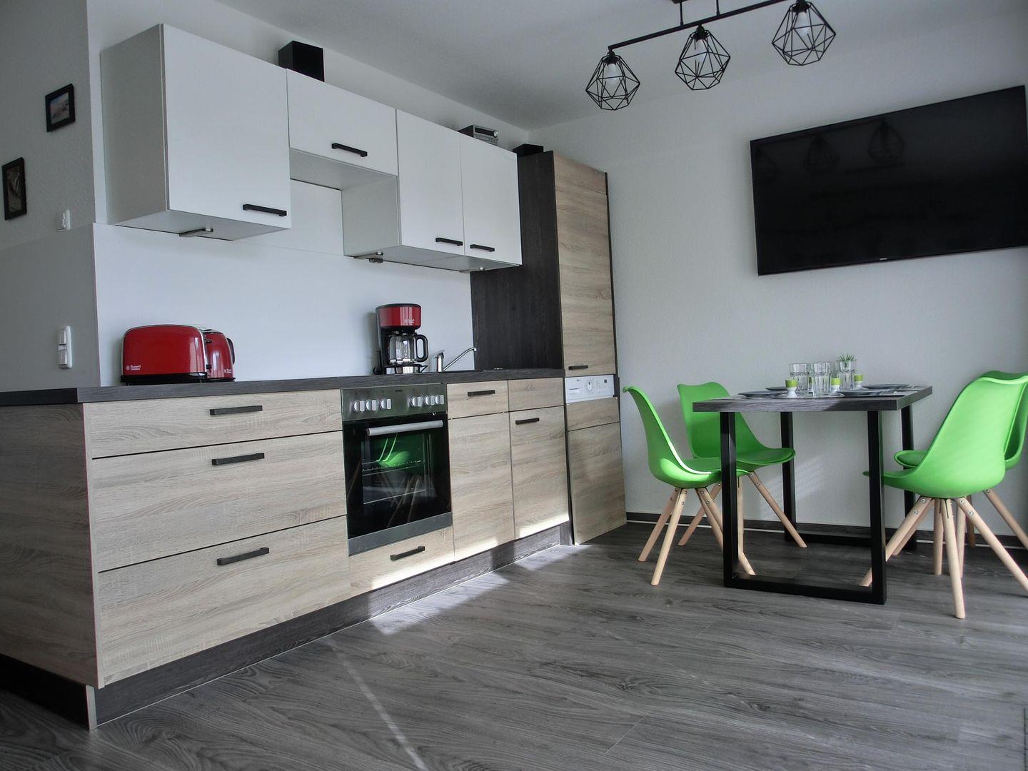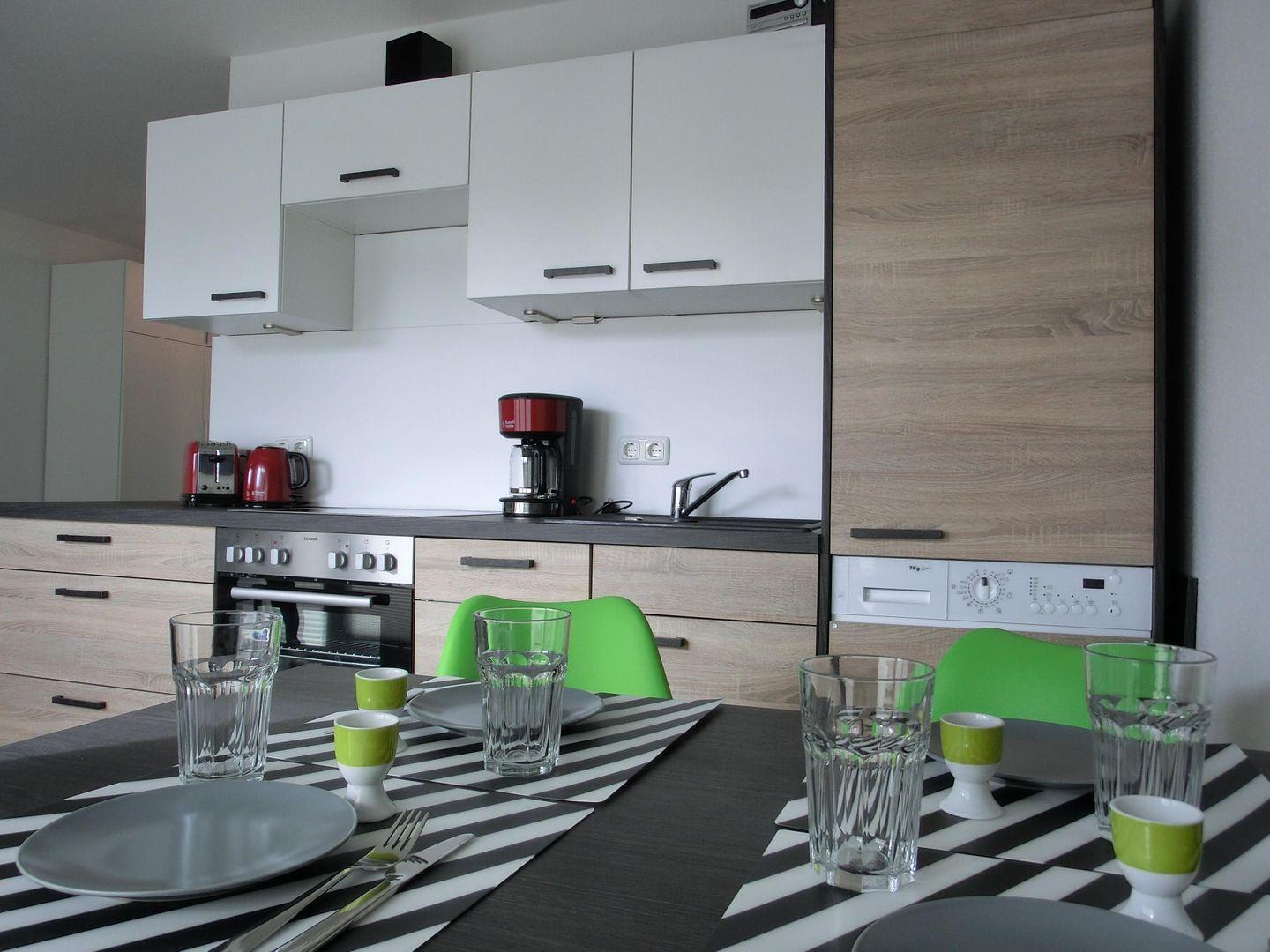 - Die offene Küche ist mit Geschirrspüler, Ceranfeld, Backofen, Kühlschrank mit Gefrierteil, Kaffeemaschine, Toaster und Wasserkocher ausgestattet.