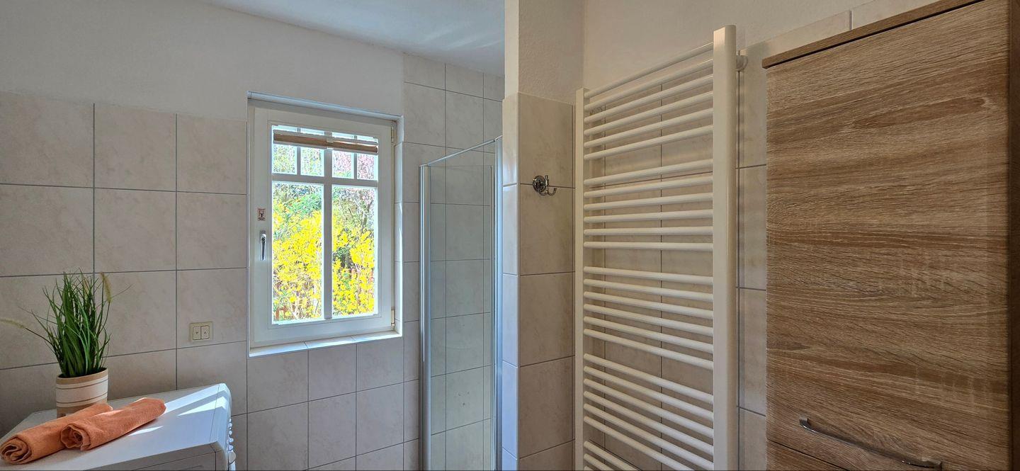 • Tageslichtbadezimmer mit Dusche, WC, Waschbecken, Spiegel und Haartrockner