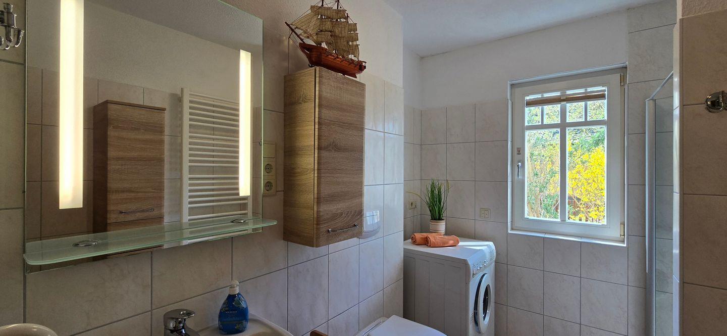 - Tageslichtbadezimmer mit Dusche, WC, Waschbecken, Spiegel, Haartrockner