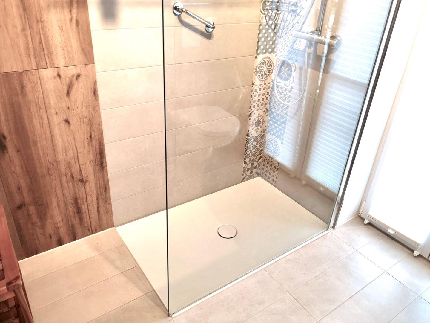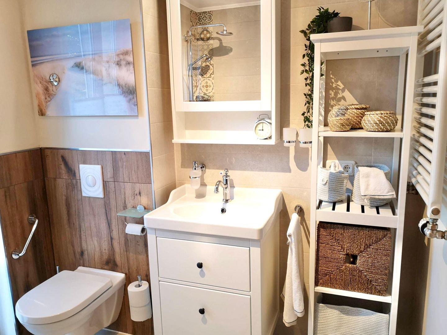 • Badezimmer mit ebenerdiger Dusche und ein Fön