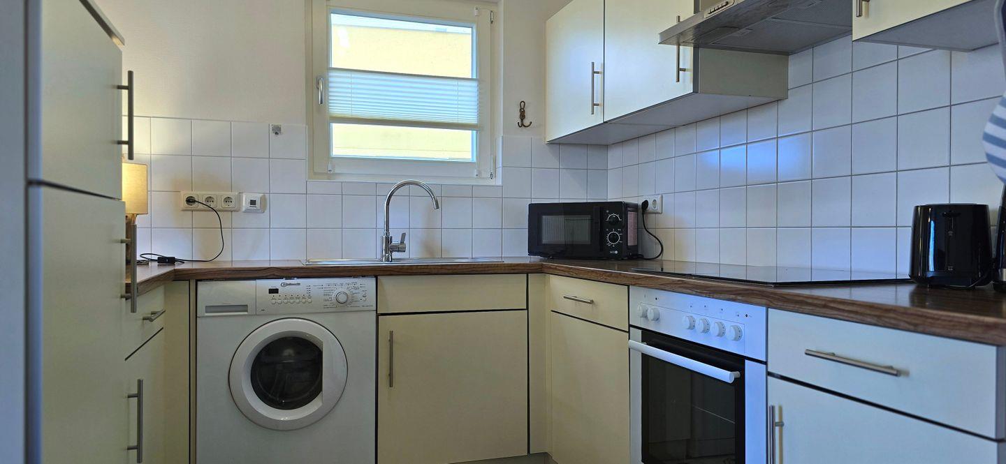 - separiert im Wohnraum eine Einbauküche, Herd, Kaffeemaschine, Tchibo-Cafisimo, Wasserkocher, Toaster, Mikrowelle, Kühlschrank mit Gefrierteil, Waschmaschine