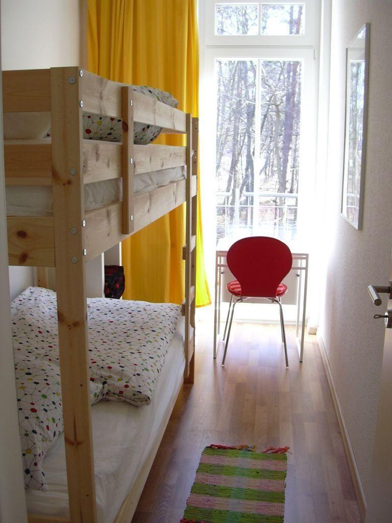 Das Schlafzimmer hat ein Doppelbett und einen geräumigen Schrank, das Kinderzimmer ein Etagenbett und einen kleinen Schreibtisch.