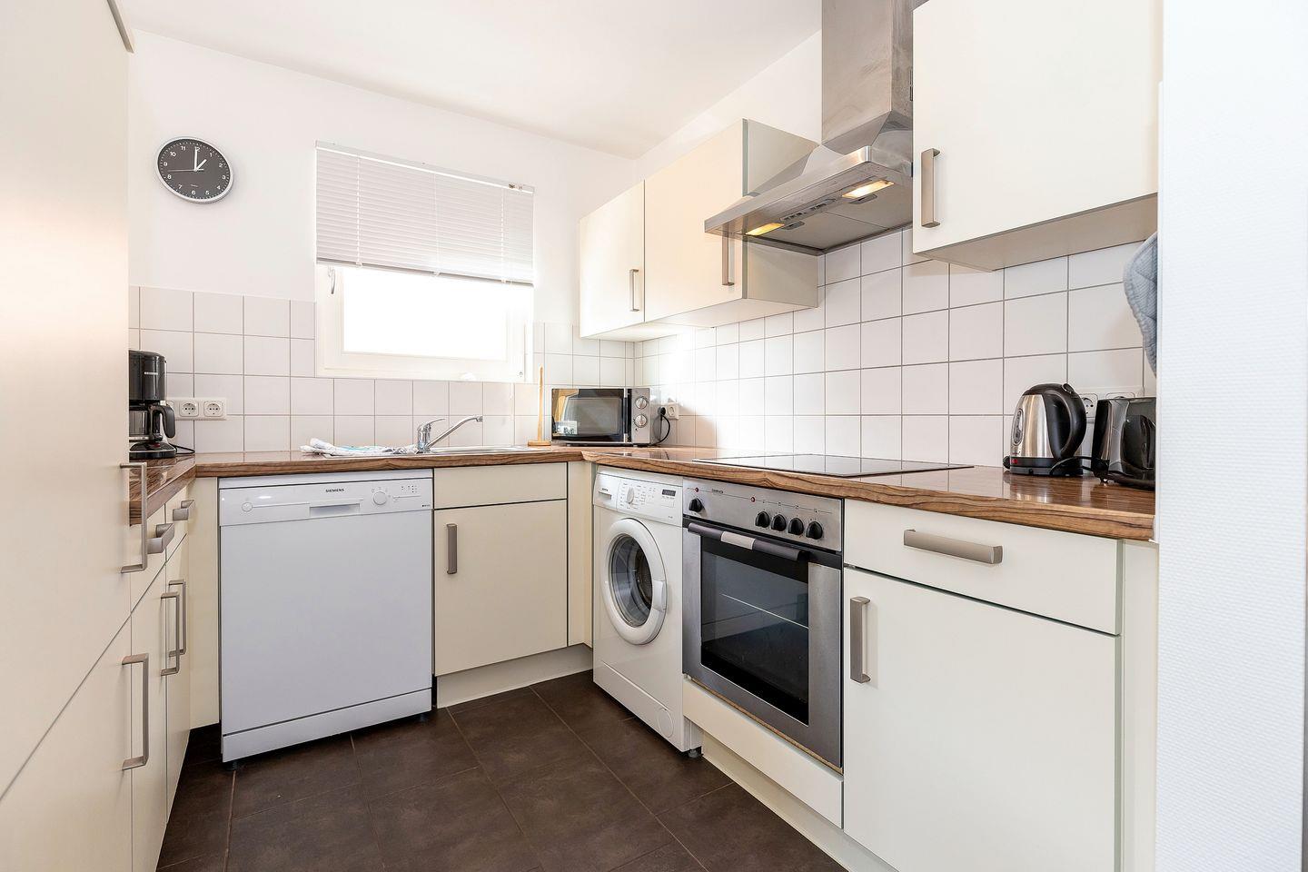 - in separater Ecke im Wohnraum ist eine Einbauküche inkl. Geschirrspüler, Herd, Backofen, Kaffeemaschine, Toaster, Kühlschrank mit Gefrierteil, Mikrowelle