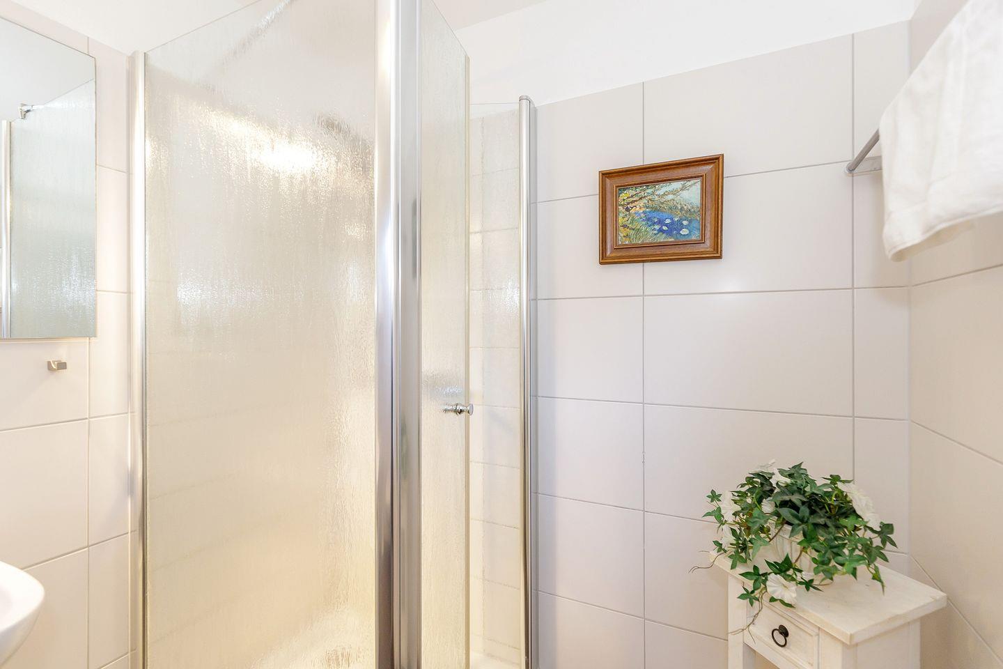 - Tageslichtbadezimmer mit ebenerdiger Dusche, Haartrockner und genügend Ablagefläche