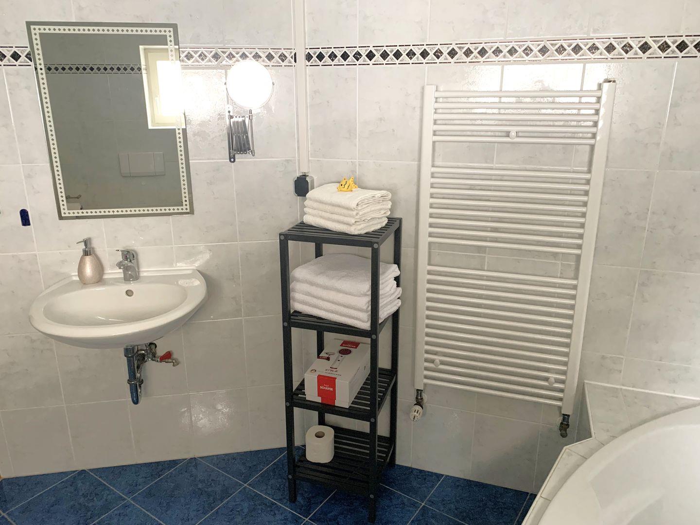 Die Unterkunft verfügt über 2 Badezimmer. Ausgestattet sind diese unter anderem mit Dusche, Badewanne, WC, Waschbecken, Kosmetikspiegel, Ganzkörperspiegel, Haartrockner sowie Badausstattung. Handtücher, Badetücher und Bettwäsche sind vorhanden. Eine Waschmaschine zur Eigennutzung, Wäscheständer, Bügeleisen, Bügelbrett, Staubsauger und Reinigungsmittel unterstützen Sie zusätzlich im Urlaub.