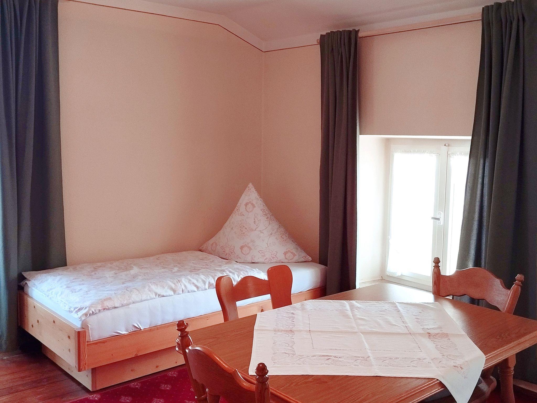 Gemütliches, helles, großes Gästezimmer mit Sitzecke und direktem Zugang zum Balkon, sowie Dusche und WC.