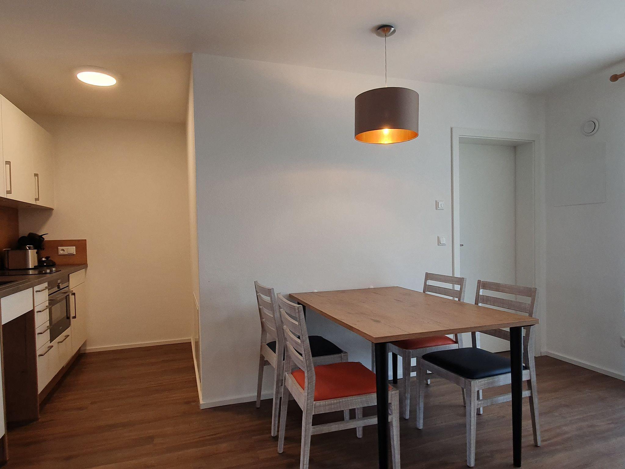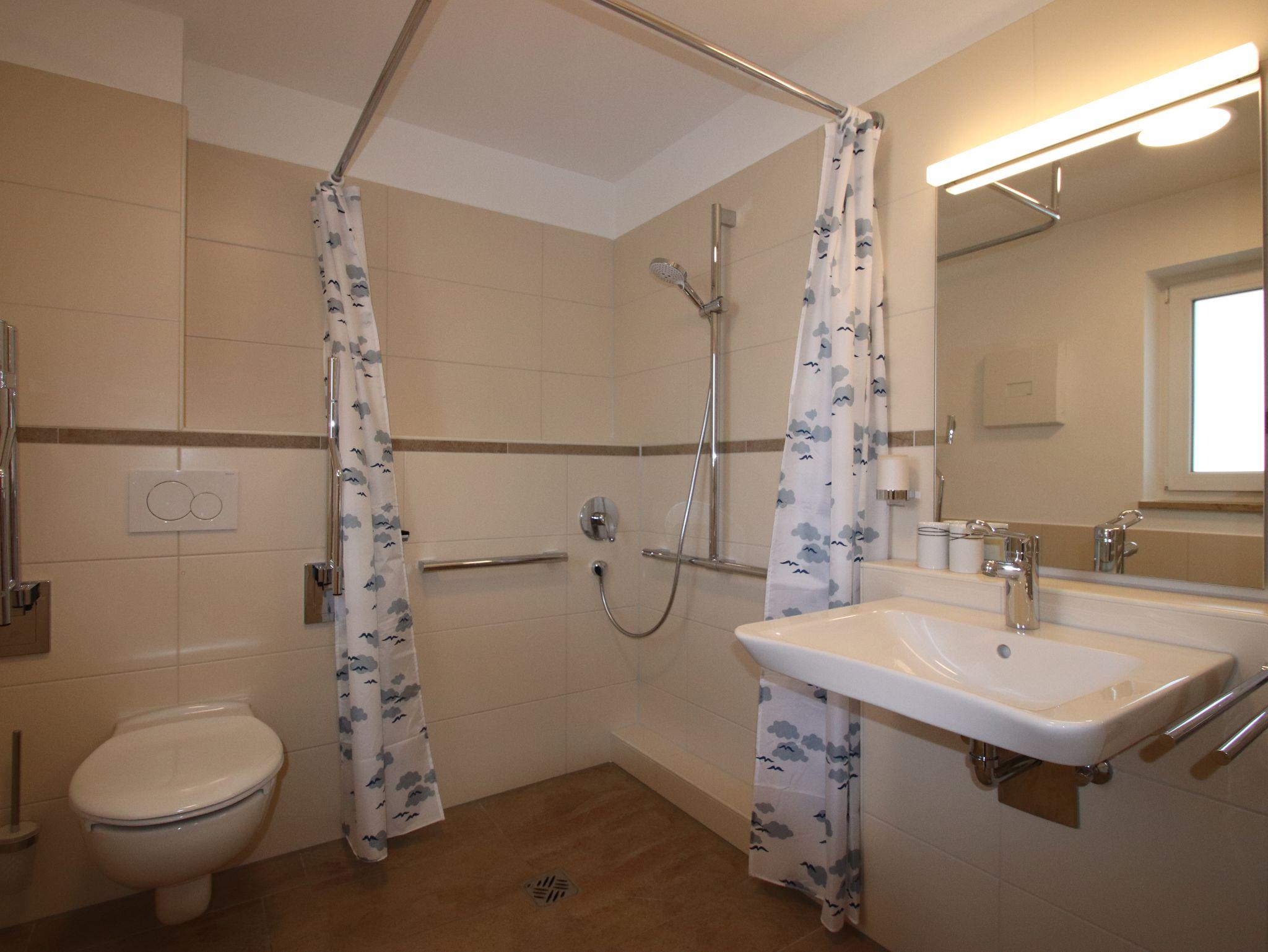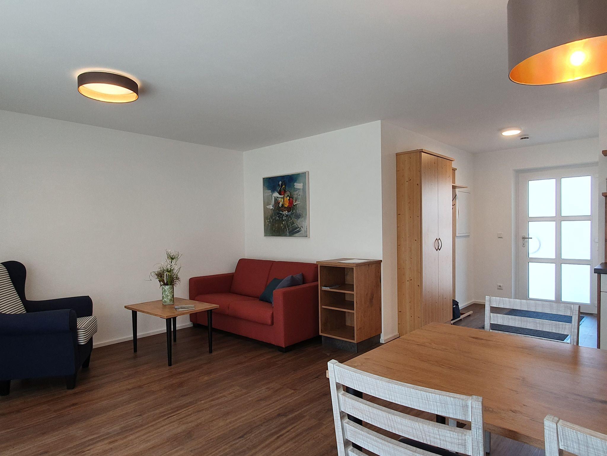 Unsere Ferienwohnung befindet sich in einem 2018 neuerbauten Haus und ist für Personen geeignet, die auf den Rollstuhl angewiesen sind. Sie ist komplett mit Fußbodenheizung ausgestattet, Fenster und Terrassentüre verfügen über Außenrollos sowie Mückenschutz. Sie bietet Platz für 1-3 Personen, ein Kinderbett sowie Hochstuhl kann zur Verfügung gestellt werden. Insgesamt ist sie 46 qm groß, mit großem Wohnraum (Ausziehcouch für die 3. Person) und einem Schlafzimmer mit Doppelbett. Im Wohnraum befindet sich eine modern ausgestattete Küchenzeile mit Geschirrspüler, Backofen bzw. Mikrowelle, Herd mit zwei Platten, Kühlschrank mit Gefrierfach, Pad-Kaffeemaschine, Toaster, Wasserkocher, Geschirrtücher. Das Bad mit Tageslicht ist barrierefrei mit behindertenfreundlicher Dusche und WC. Selbstverständlich sind Bettwäsche und Handtücher im Preis inbegriffen. Fernseher, kostenfreies W-Lan, Carport. Die Wohnung hat eine große Terrasse mit Sitzecke sowie zwei Liegestühlen.